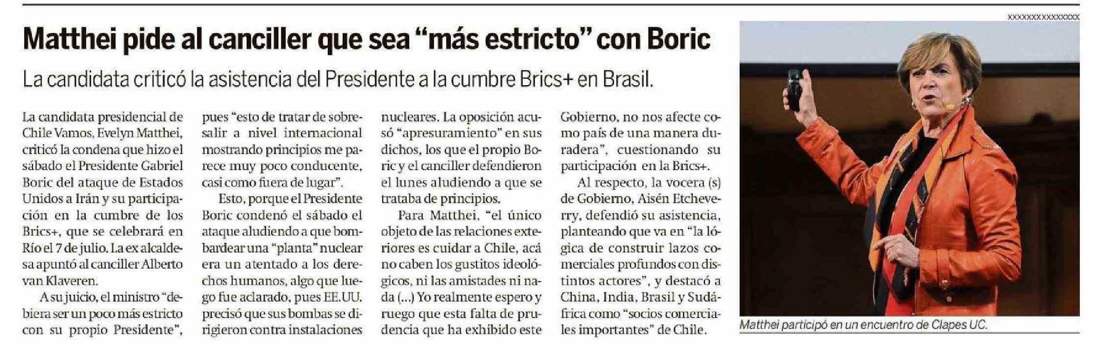 | Título: | Matthei pide al canciller que sea "más estricto" con Boric |