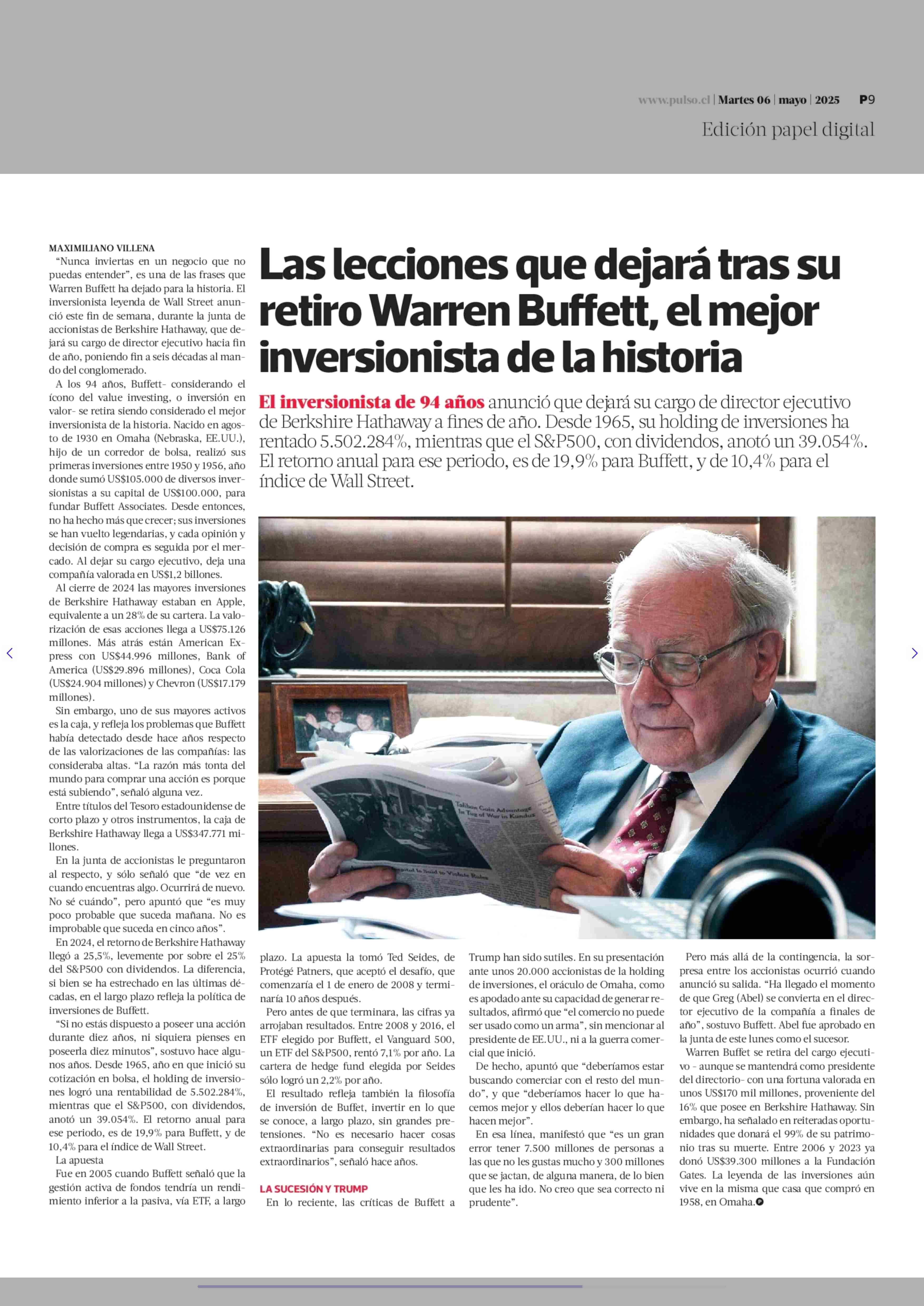 Las lecciones que dejará tras su retiro Warren Buffett, el mejor inversionista de la historia 06-05-2025 La Tercera |