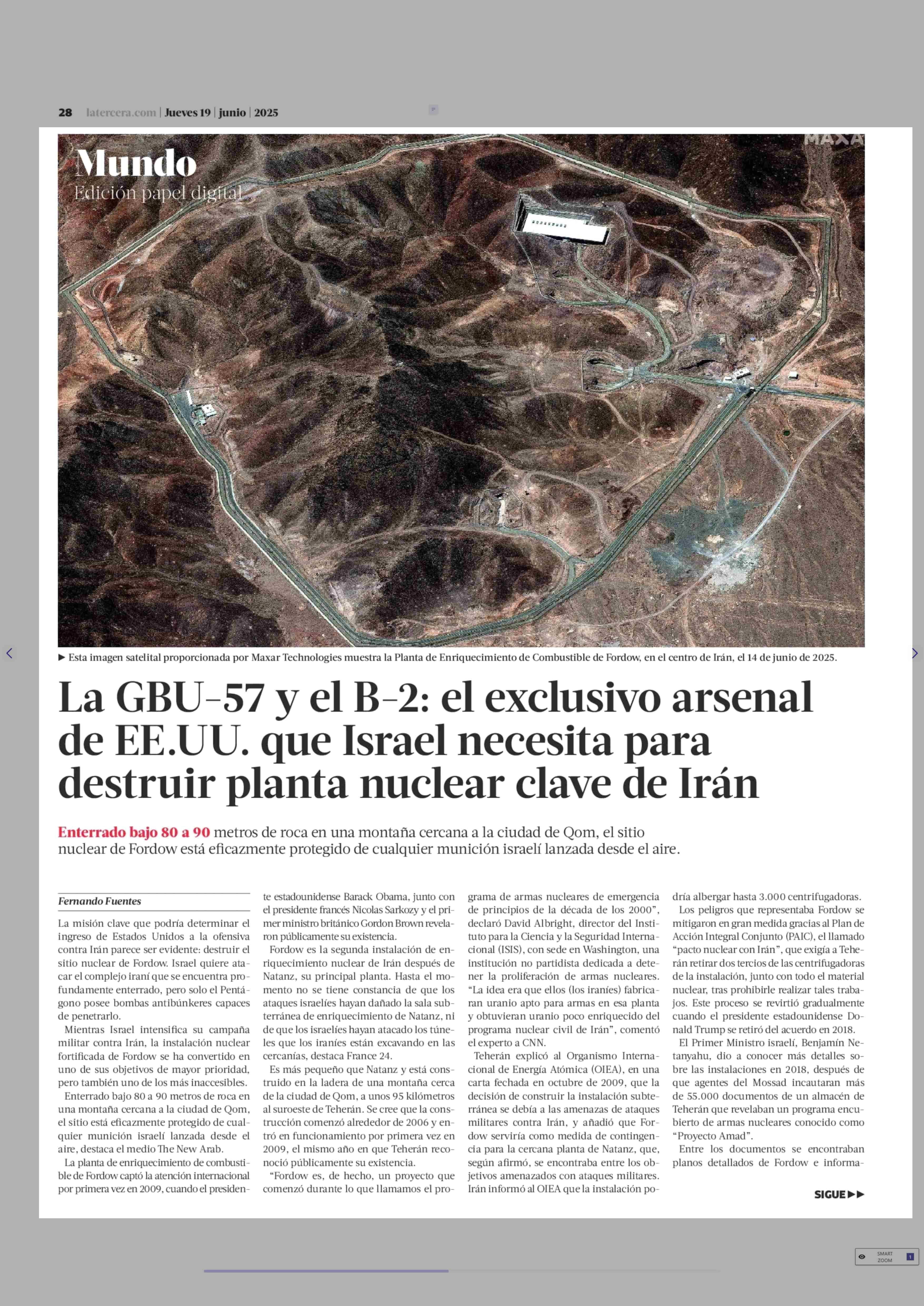 La GBU-57 y el B-2: el exclusivo arsenal de EE.UU. que Israel necesita para destruir planta nuclear clave de Irán 19-06-2025 La Tercera |
