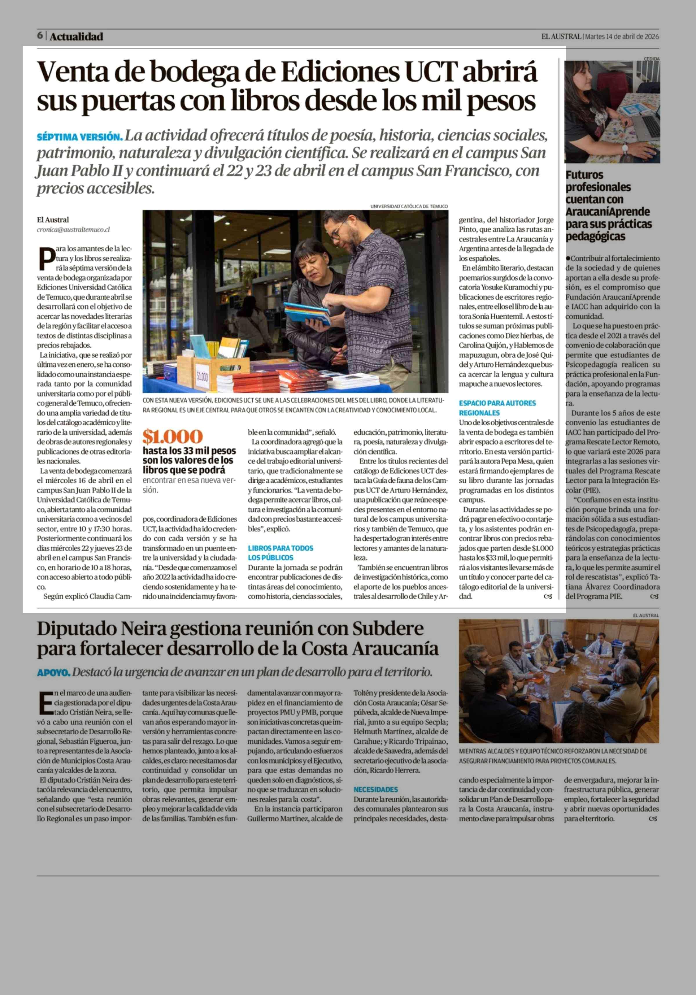 Venta de bodega de Ediciones UCT abrirá sus puertas con libros desde los mil pesos 14-04-2026 El Austral de la Araucanía |