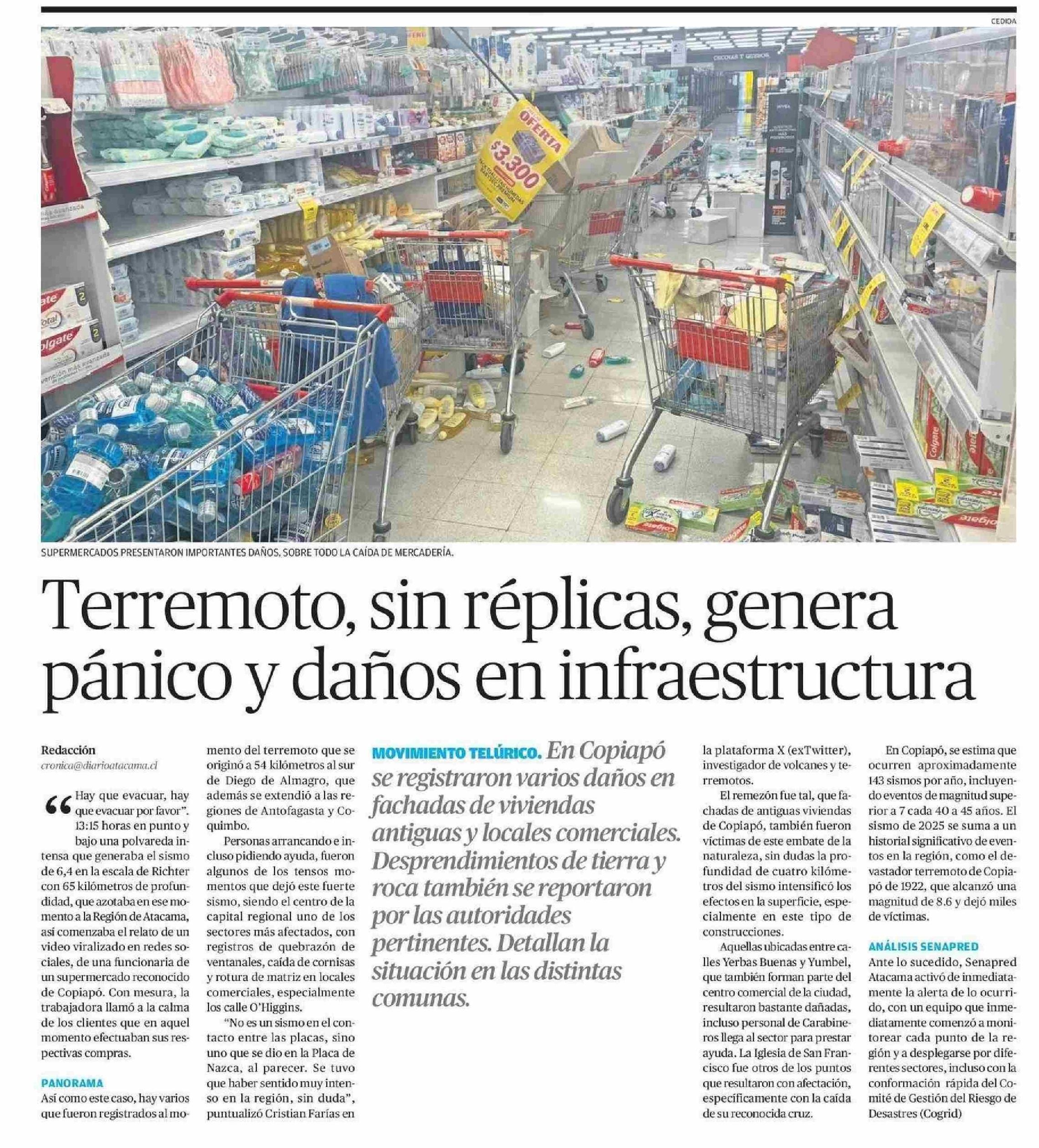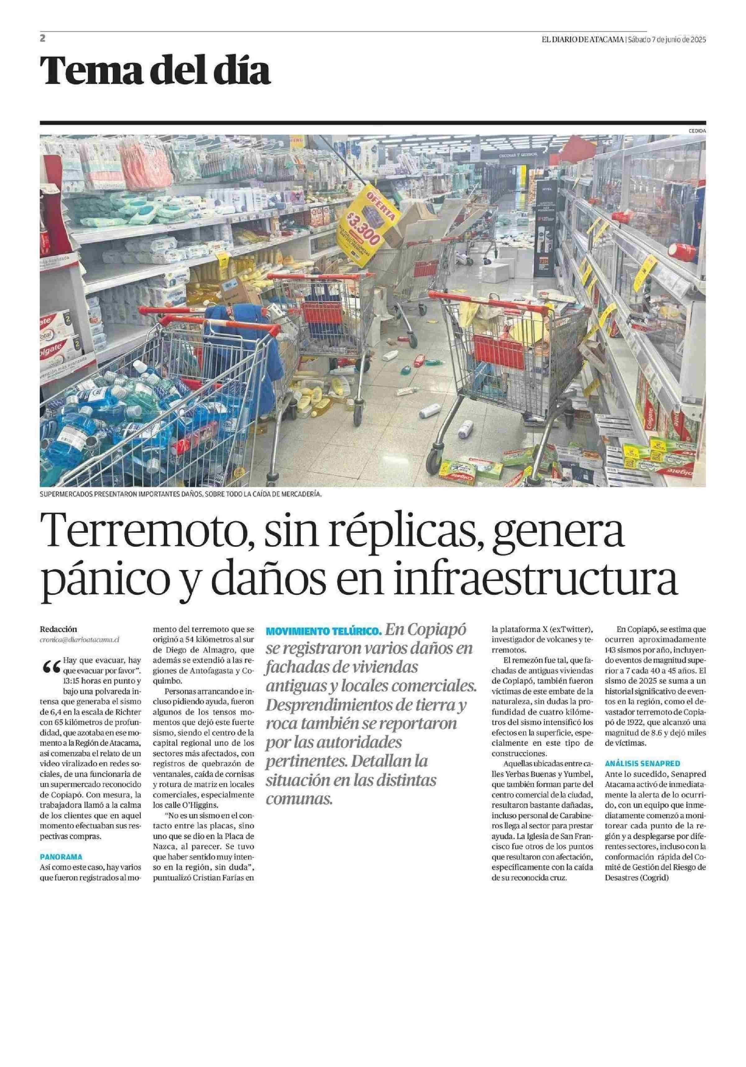 Terremoto, sin réplicas, genera pánico y daños en infraestructura 07-06-2025 El Diario de Atacama |