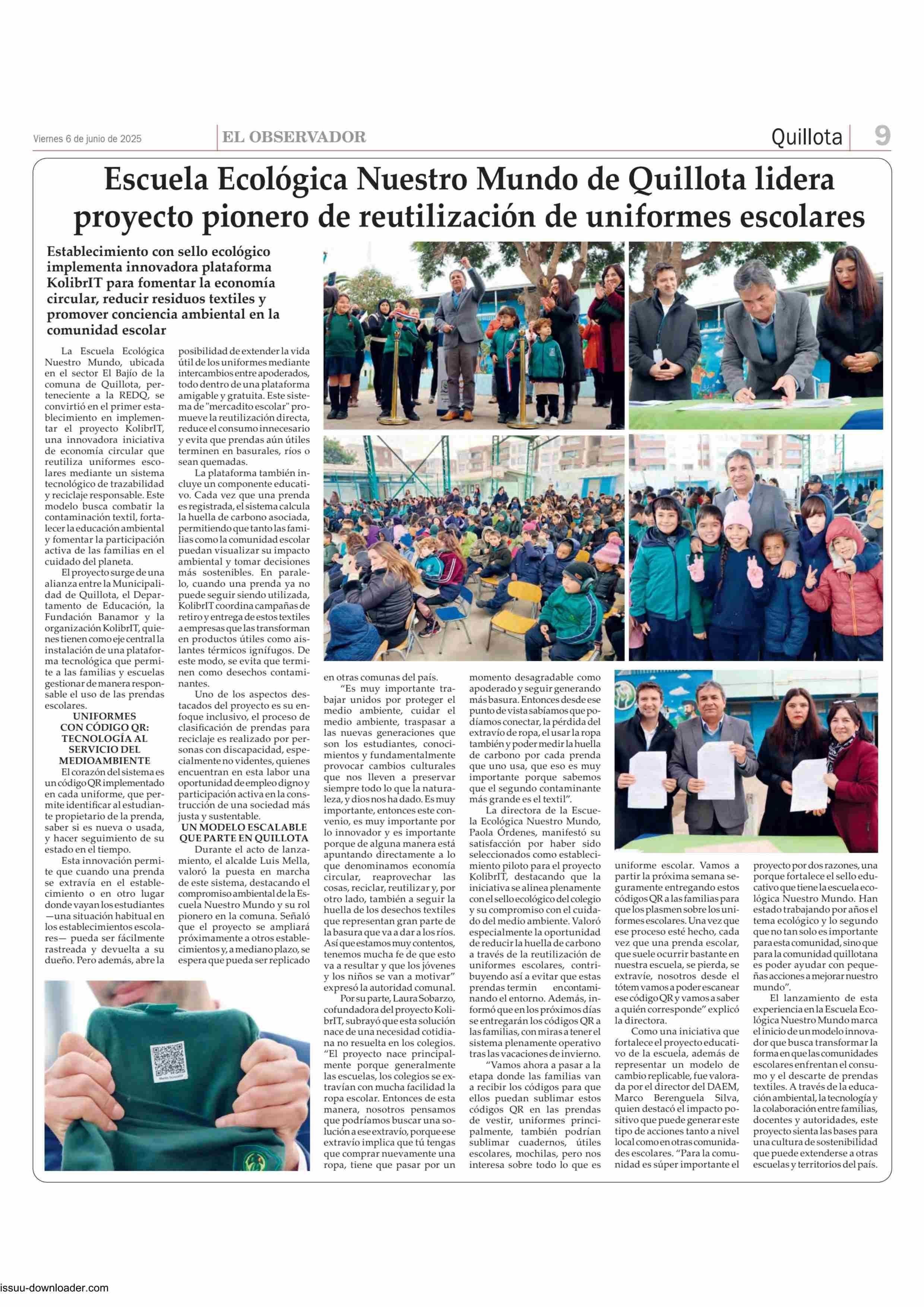 Escuela Ecológica Nuestro Mundo de Quillota lidera proyecto pionero de reutilización de uniformes escolares 06-06-2025 El Observador |