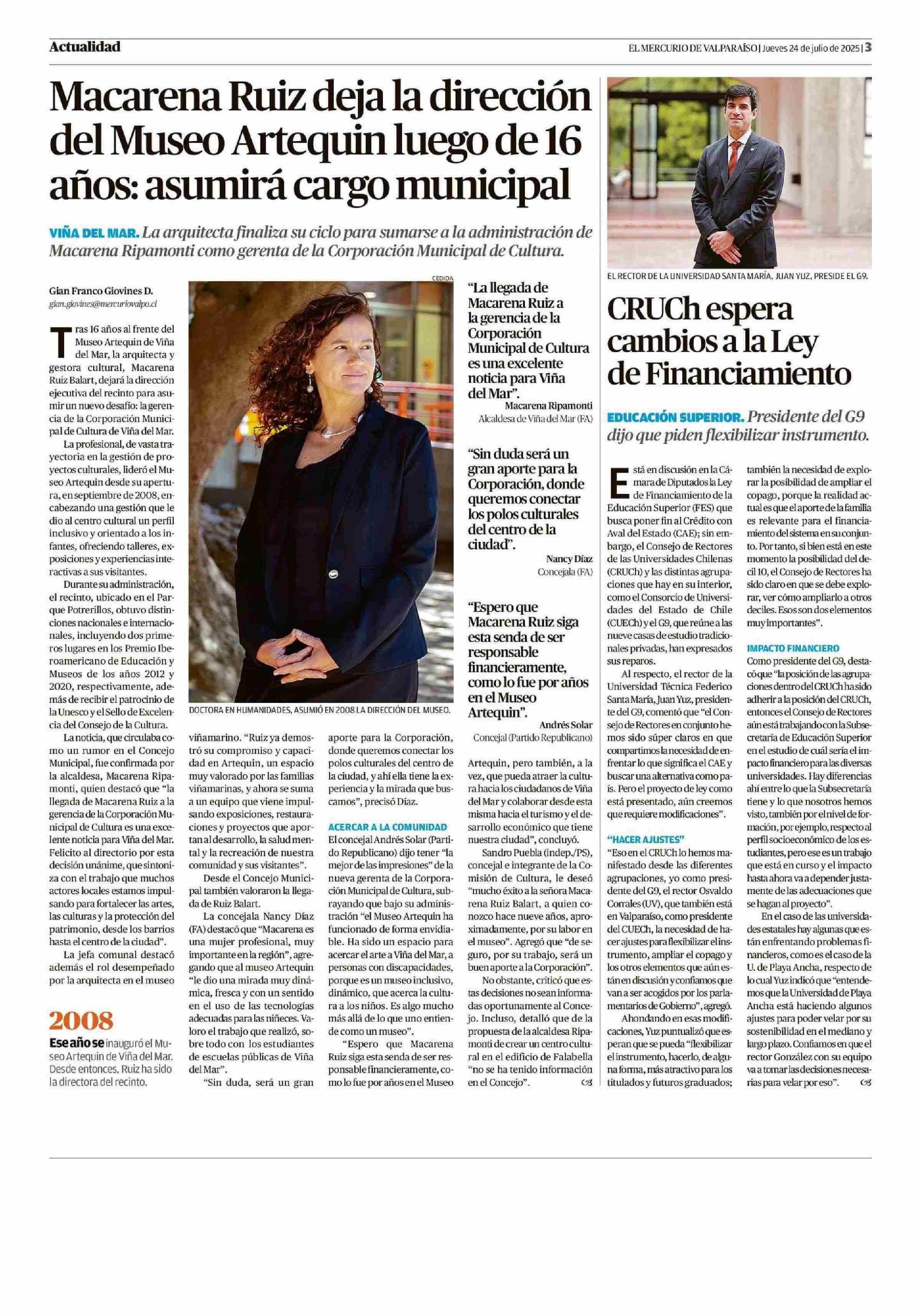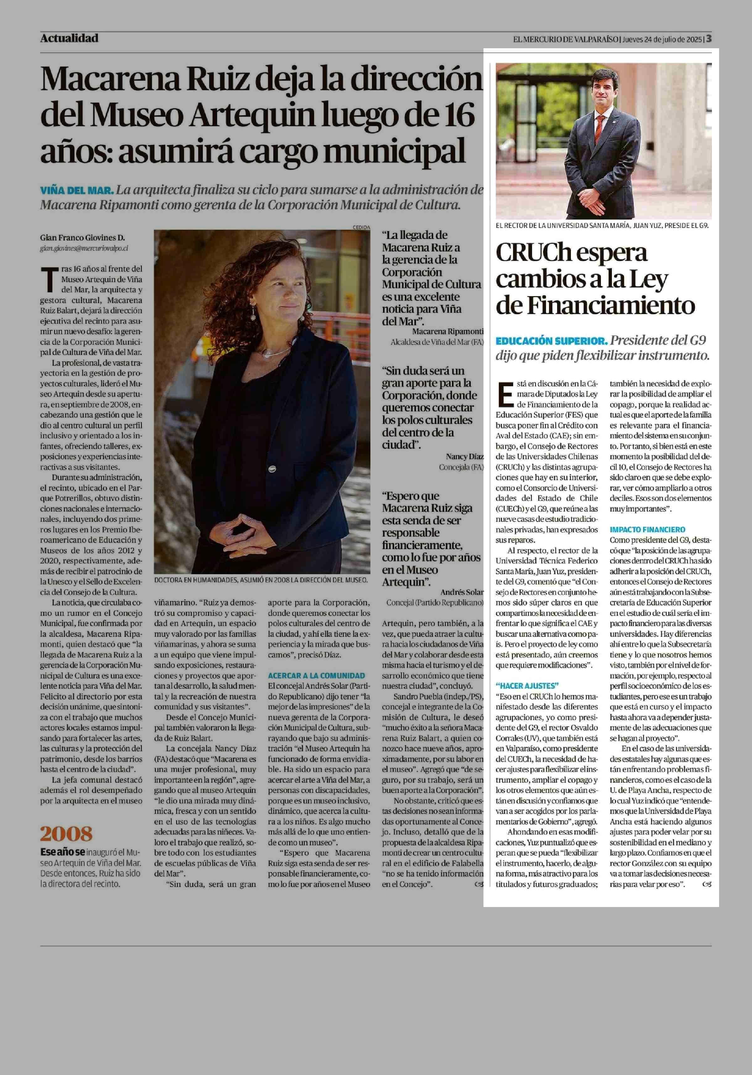 CRUCh espera cambios a la Ley de Financiamiento 24-07-2025 El Mercurio de Valparaíso |