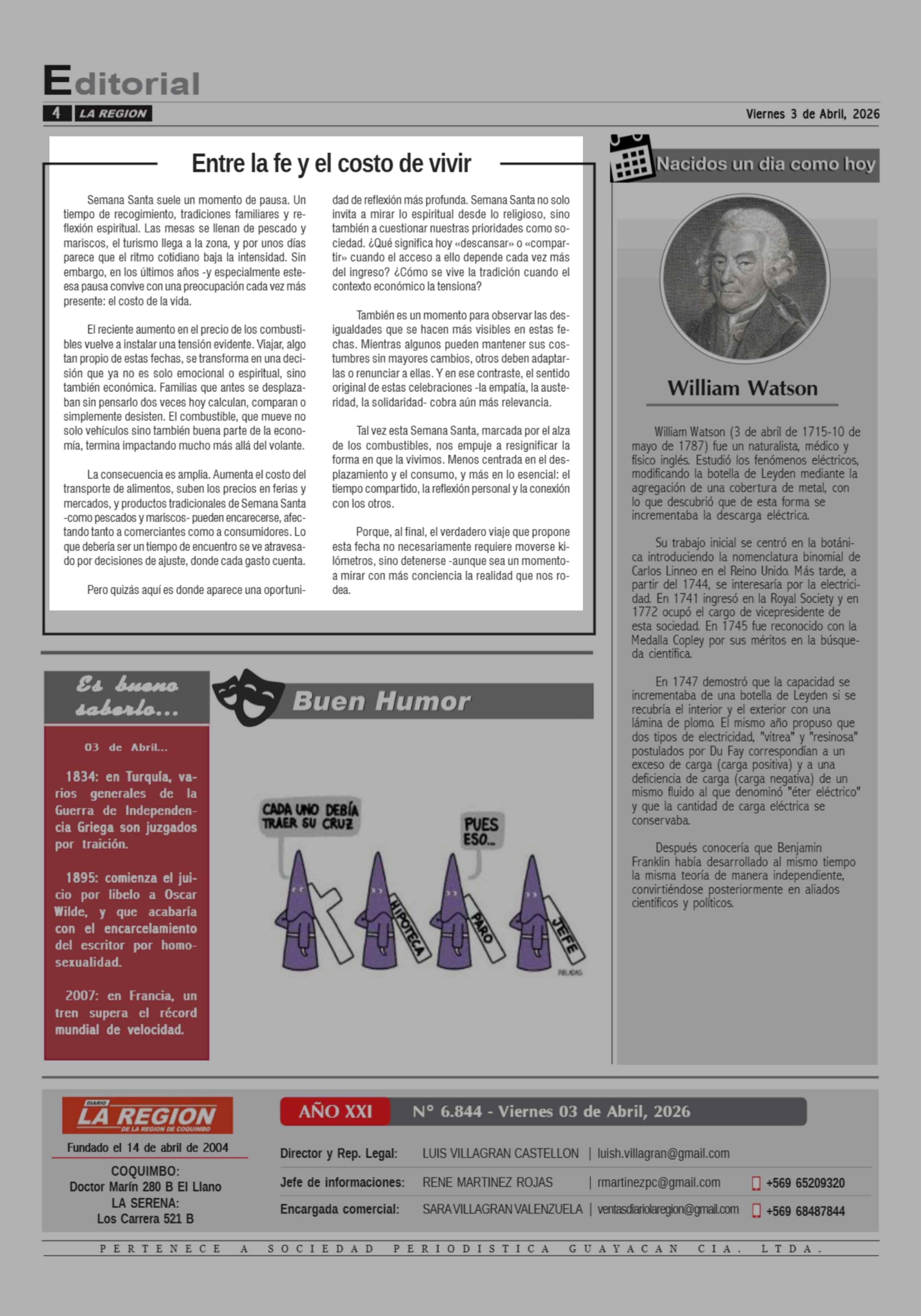 Editorial: Entre la fe y el costo de vivir 03-04-2026 Diario la Región |