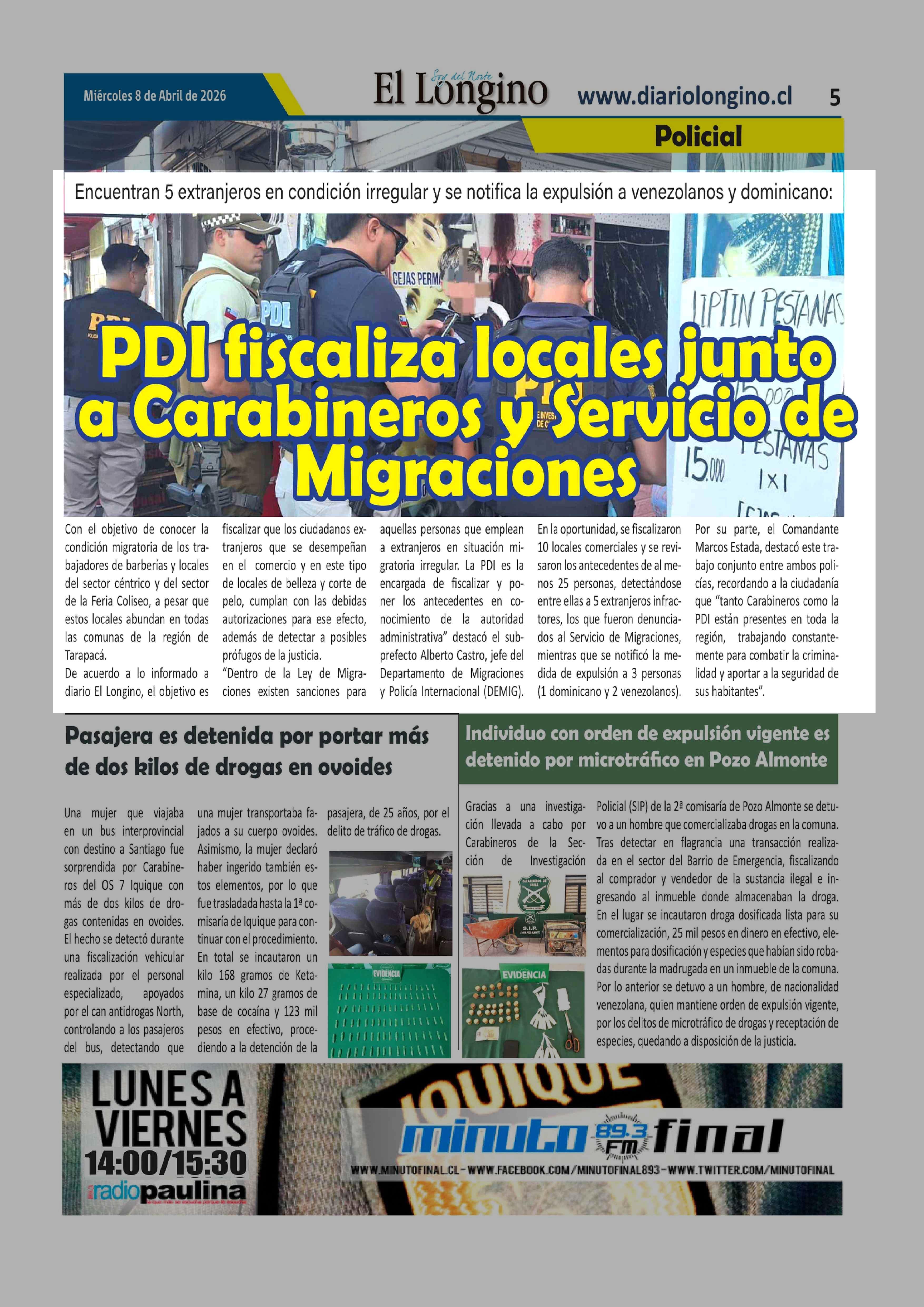 PDI fiscaliza locales junto a Carabineros y Servicio de Migraciones 08-04-2026 El Longino |