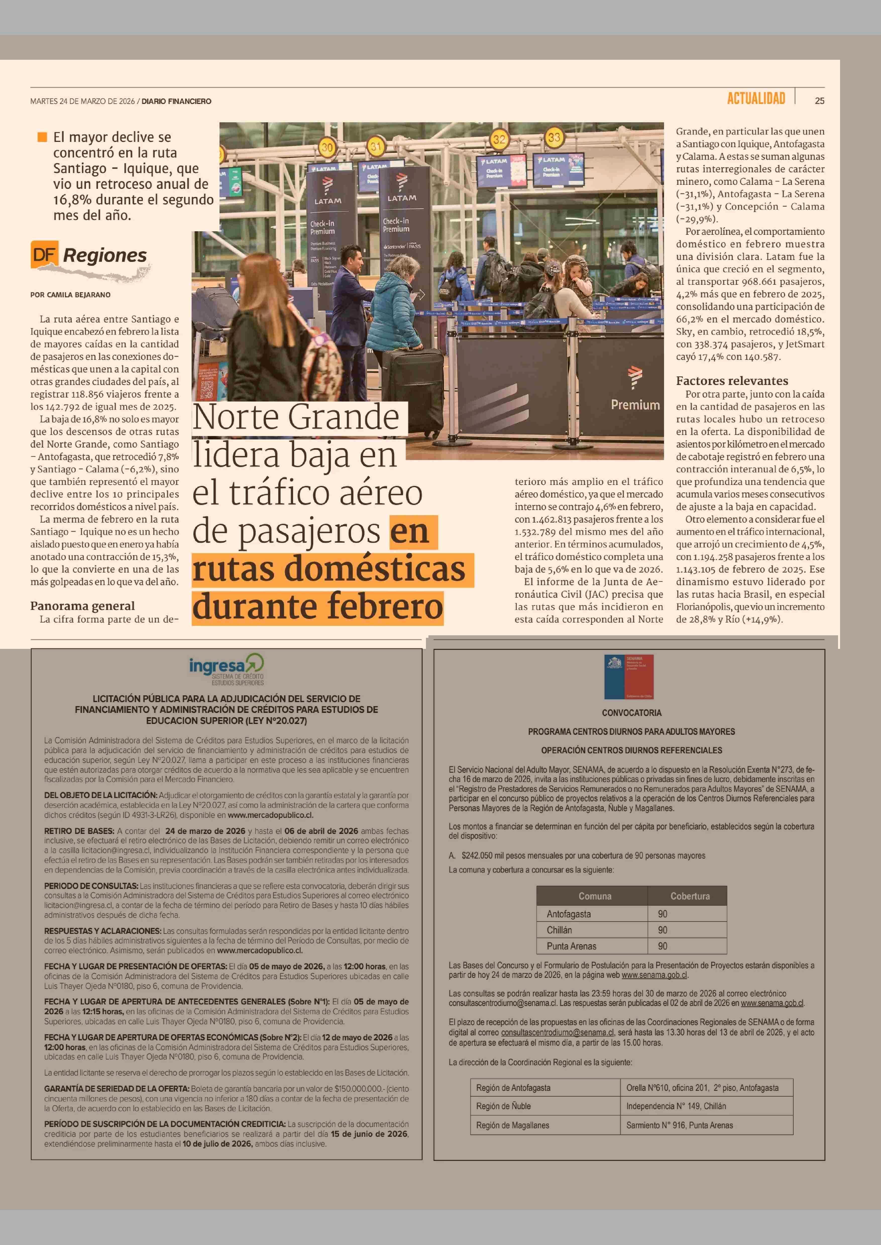 TS Norte Grande $ 2 lidera baja en == el tráfico aéreo de pasajeros en rutas domésticas durante febrero 24-03-2026 Diario Financiero |