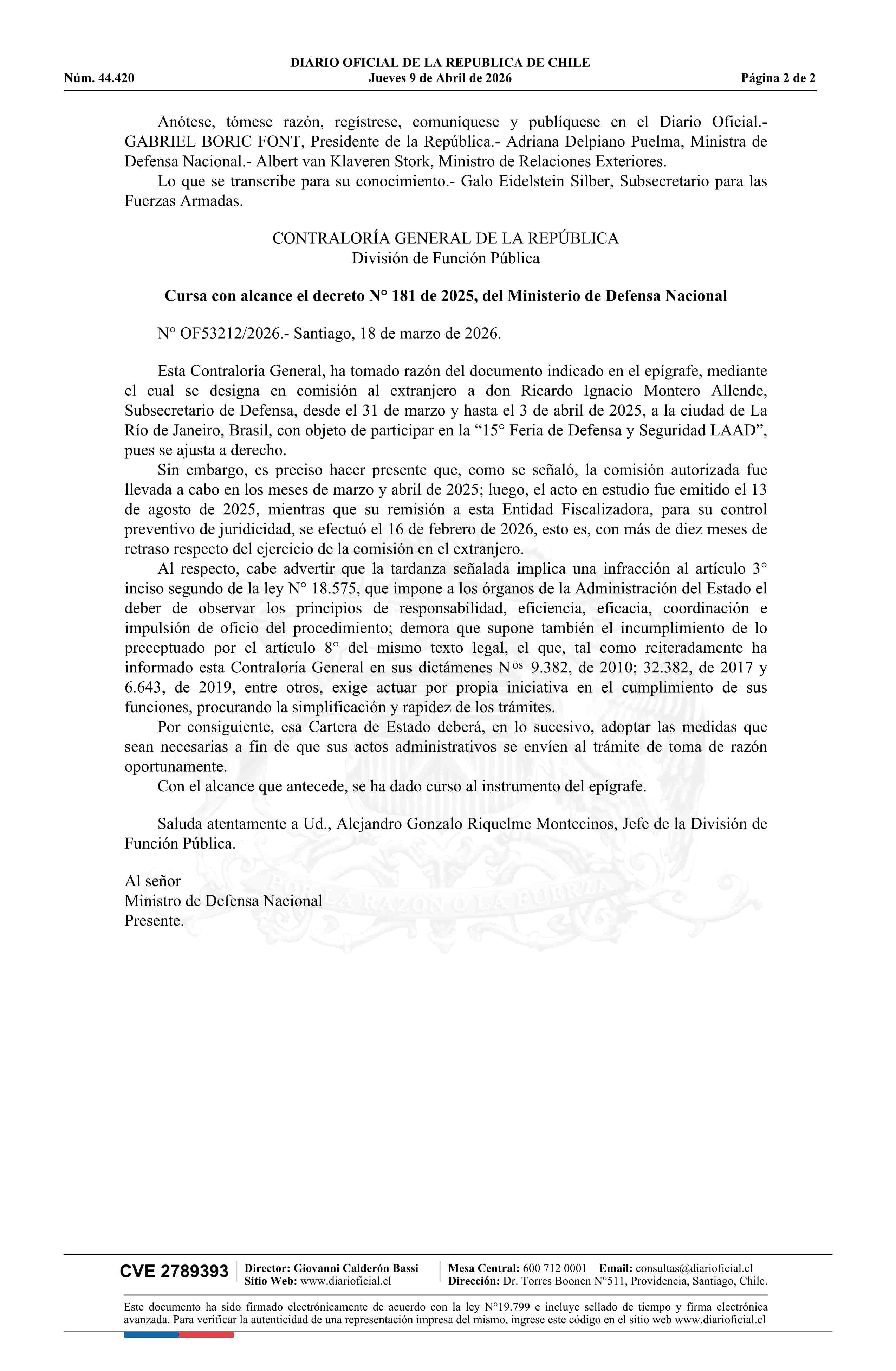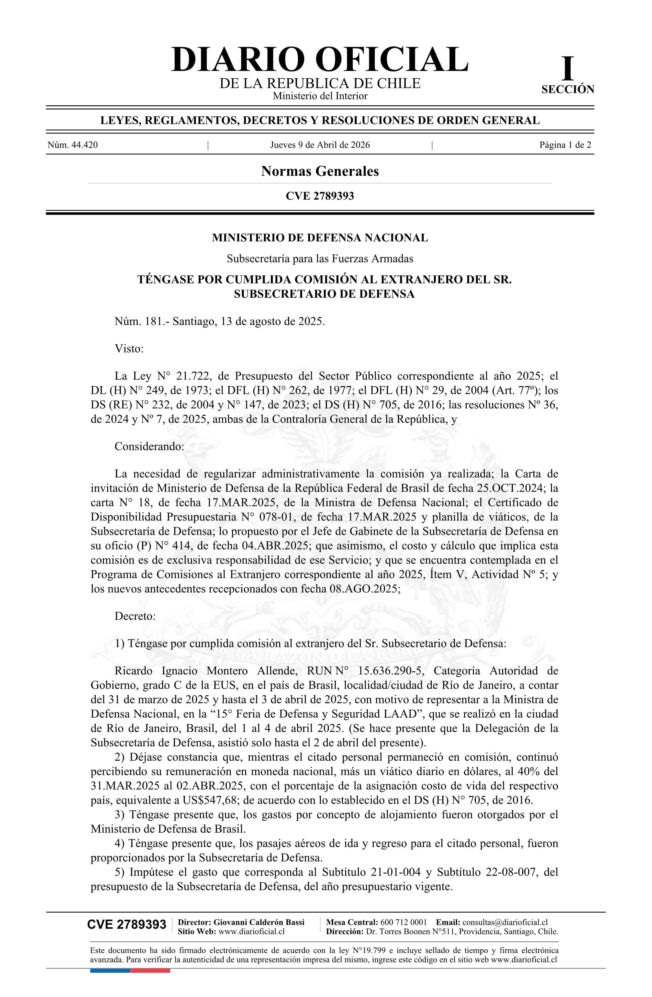 Título: Decreto número 181, de 2025.- Tiene por cumplida comisión al extranjero de don Ricardo Ignacio Montero Allende, Subsecretario de Defensa