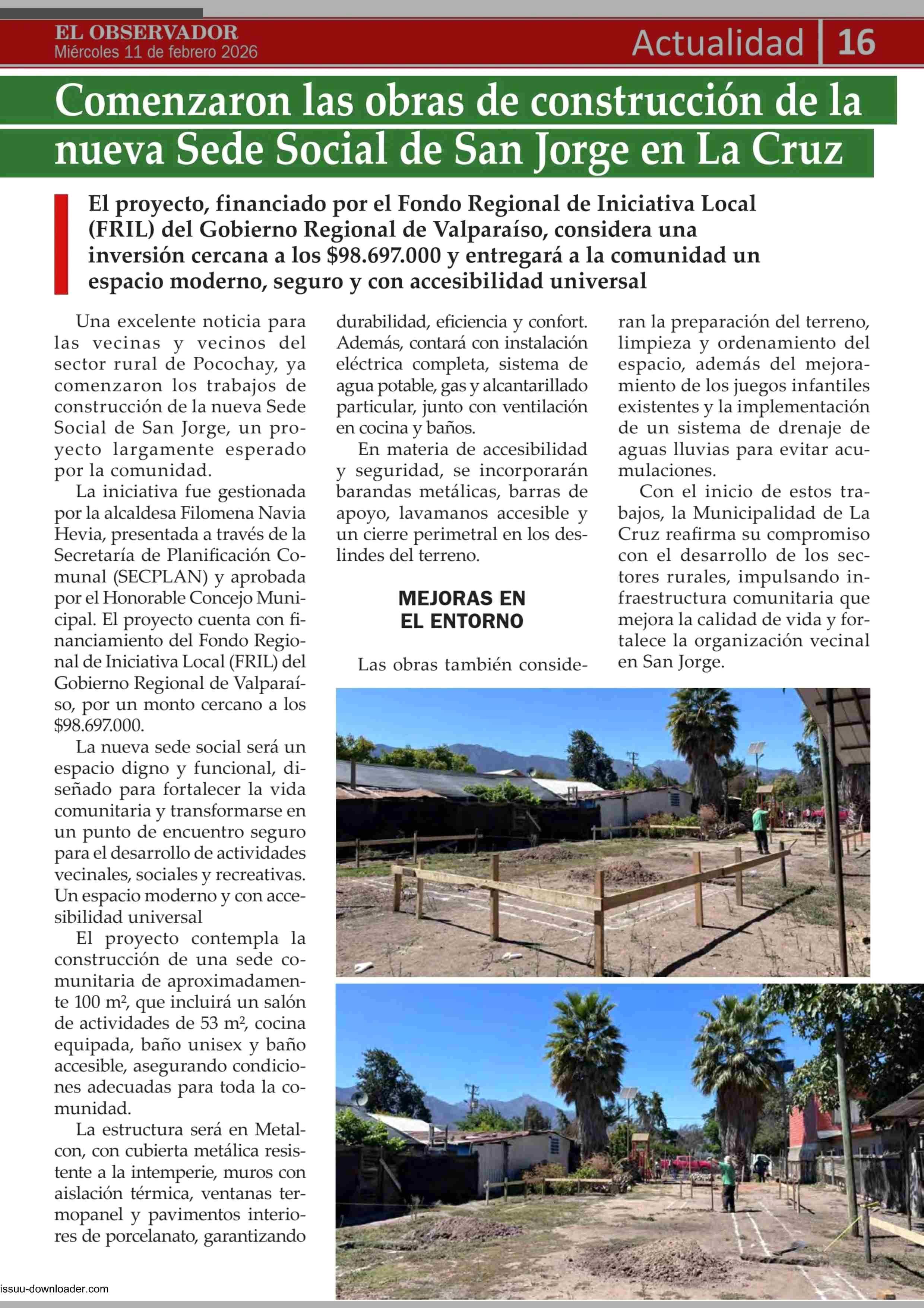 Comenzaron las obras de construcción de la nueva Sede Social de San Jorge en La Cruz 11-02-2026 El Observador Vespertino |