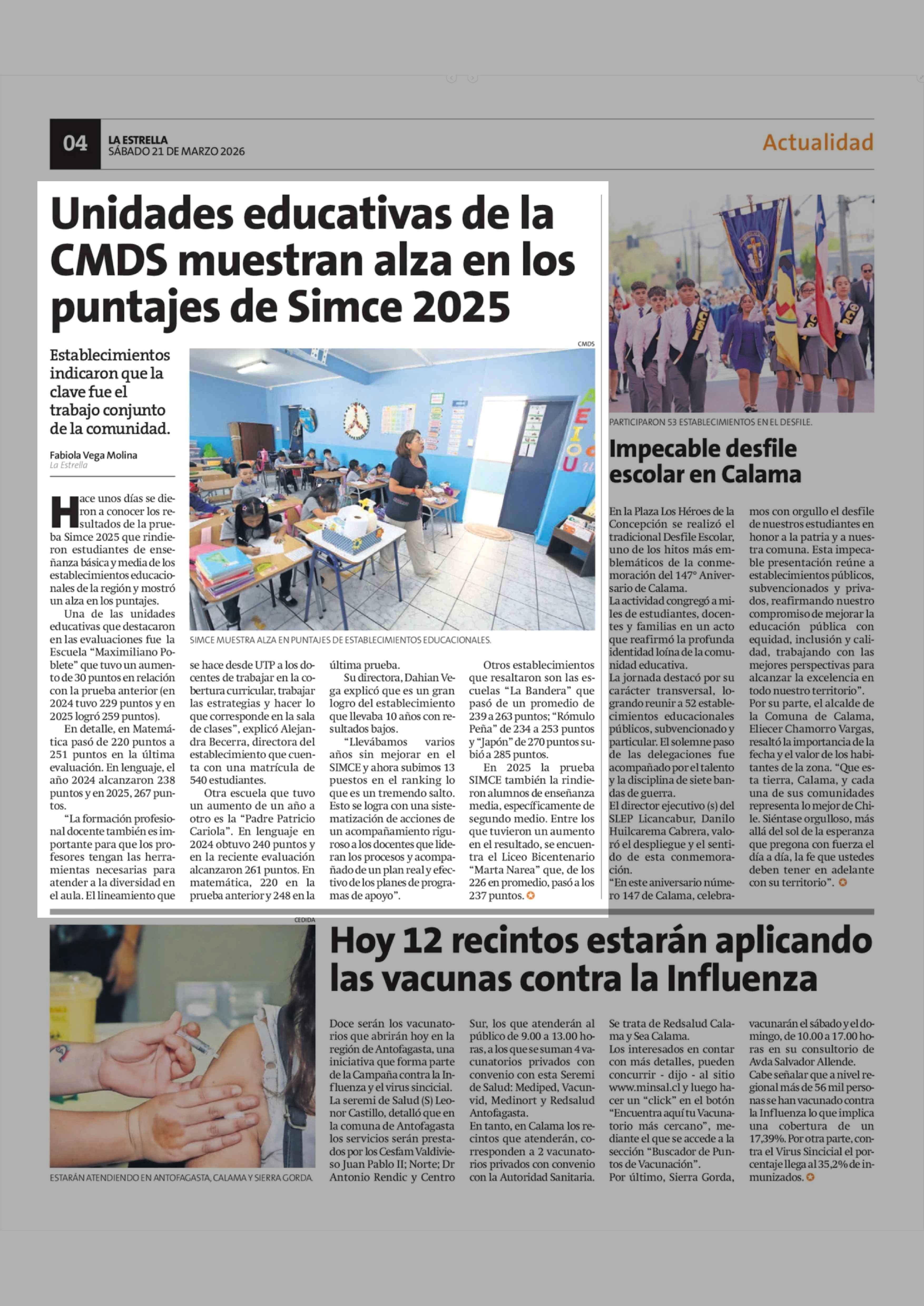 Unidades educativas de la CMDS muestran alza en los puntajes de Simce 2025 21-03-2026 La Estrella de Antofagasta |