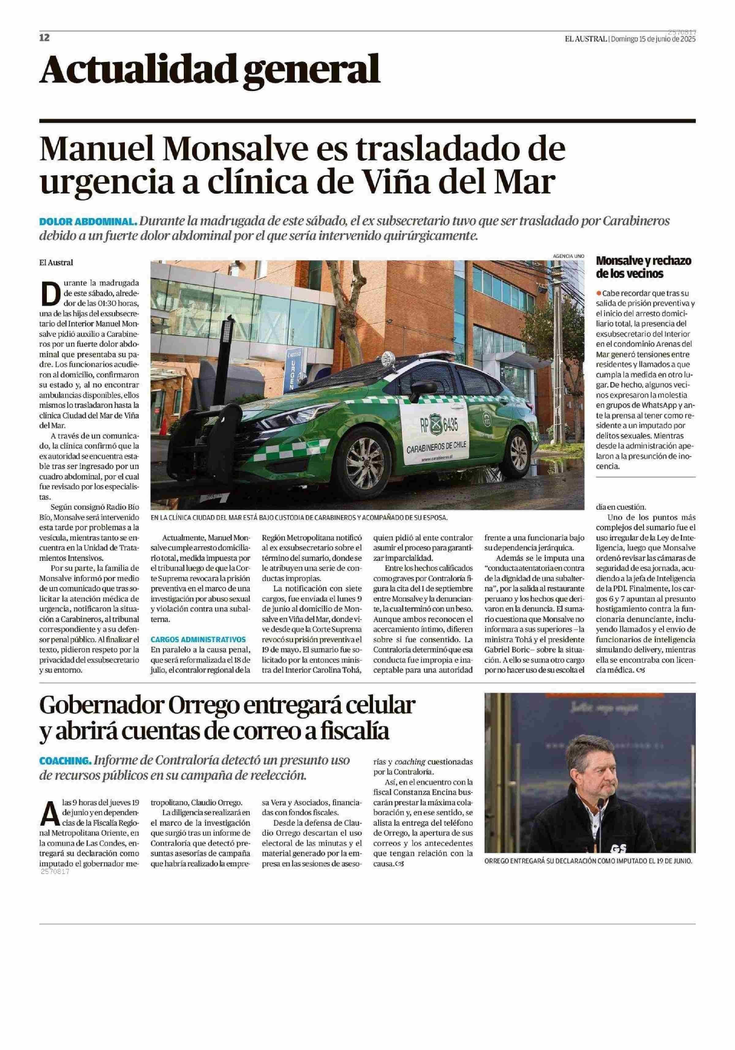 Manuel Monsalve es trasladado de urgencia a clínica de Viña del Mar 15-06-2025 El Austral de la Araucanía |