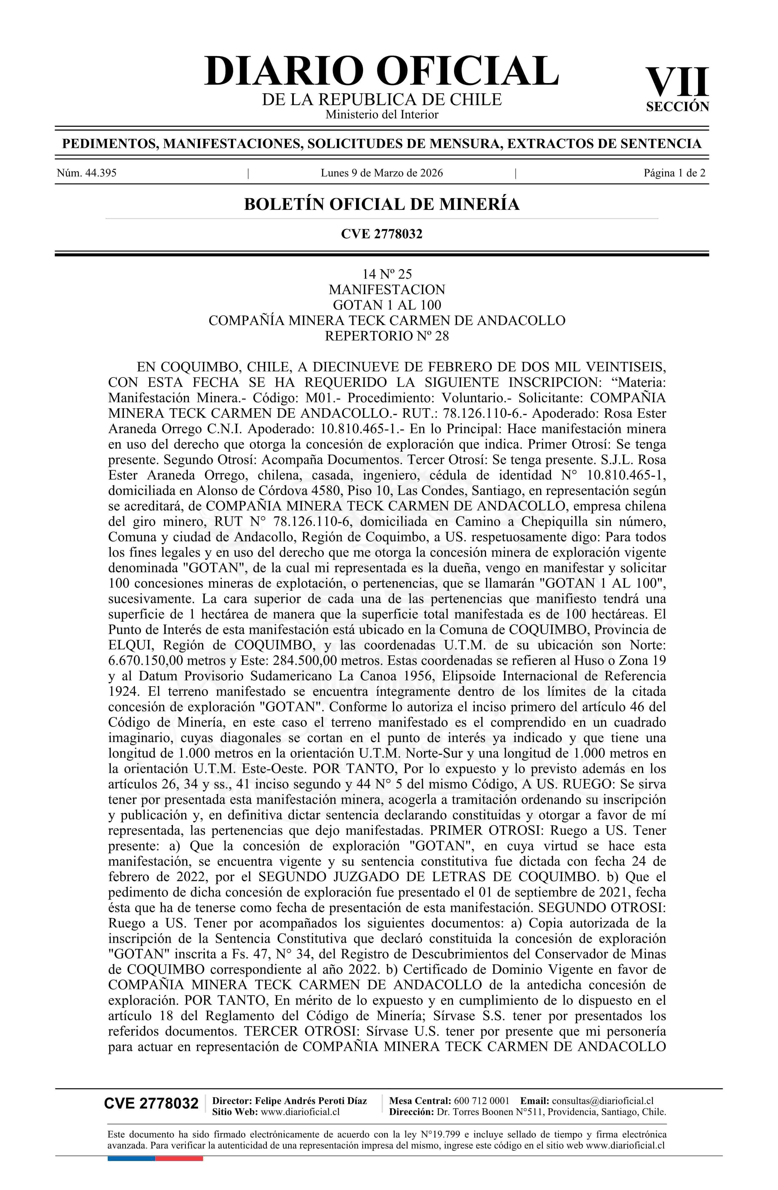 Fuente: DIARIO OFICIAL CHILE - BOLETÍN OFICIAL DE MINERÍA (DIARIO OFICIAL CHILE – BOM – MANIFESTACIONES MIN) Página(s): 16-17