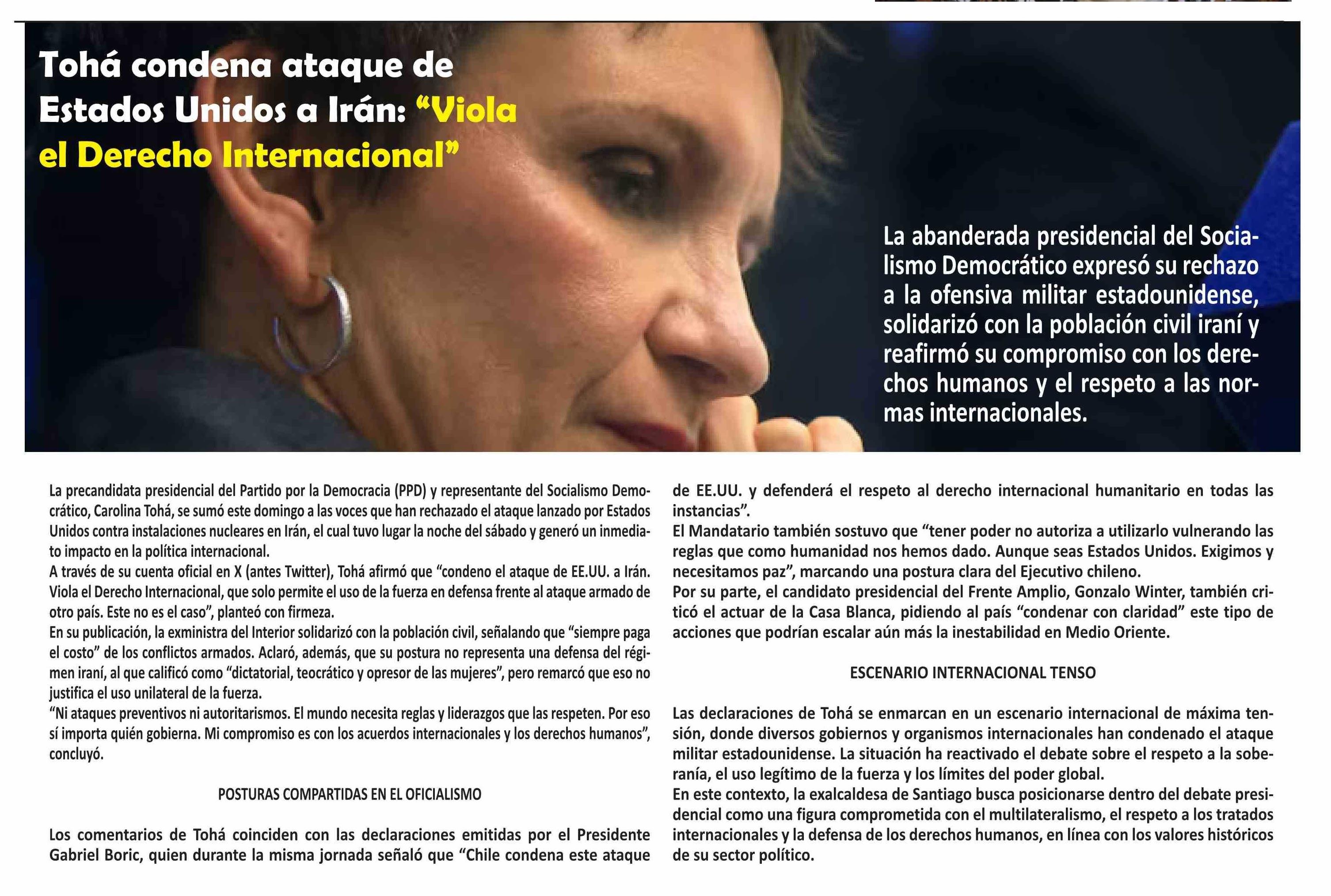 | Título: | Tohá condena ataque de Estados Unidos a Irán: “Viola el Derecho Internacional” |