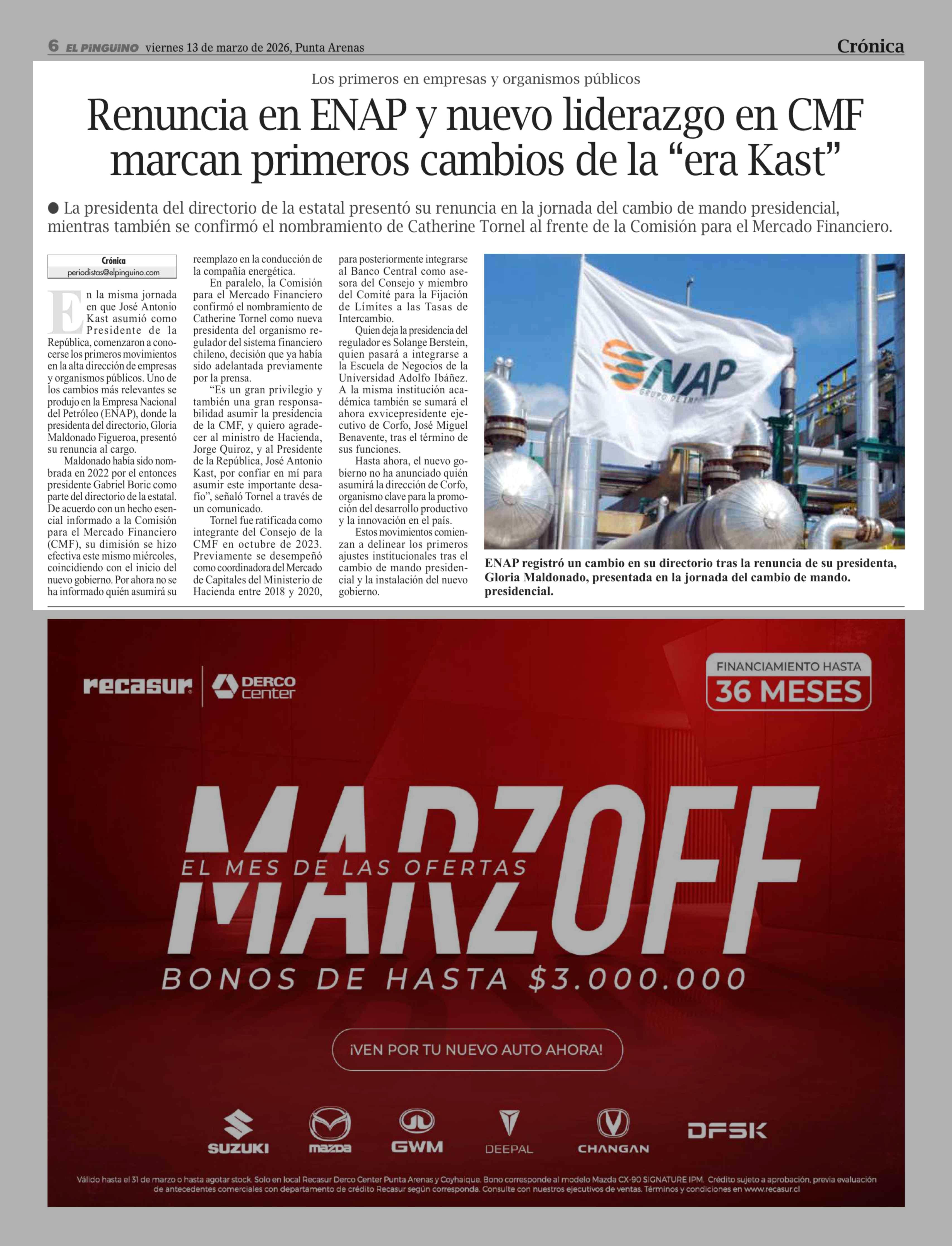Título: Renuncia en ENAP y nuevo liderazgo en CMF marcan primeros cambios de la "era Kast"