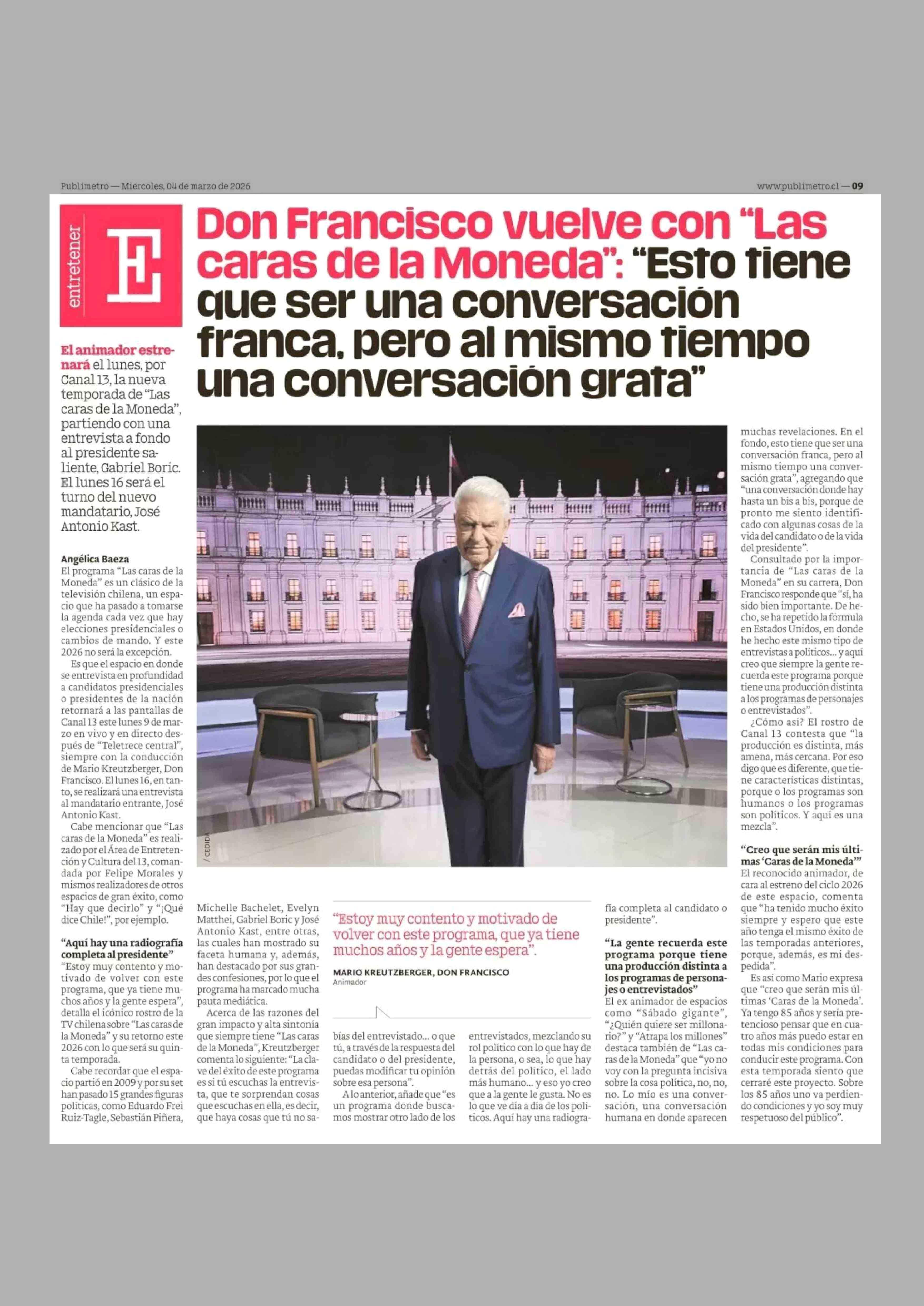 Don Francisco vuelve con "Las caras de la Moneda": "Esto tiene que ser una conversación franca, pero al mismo tiempo una conversación grata" 04-03-2026 Publimetro |