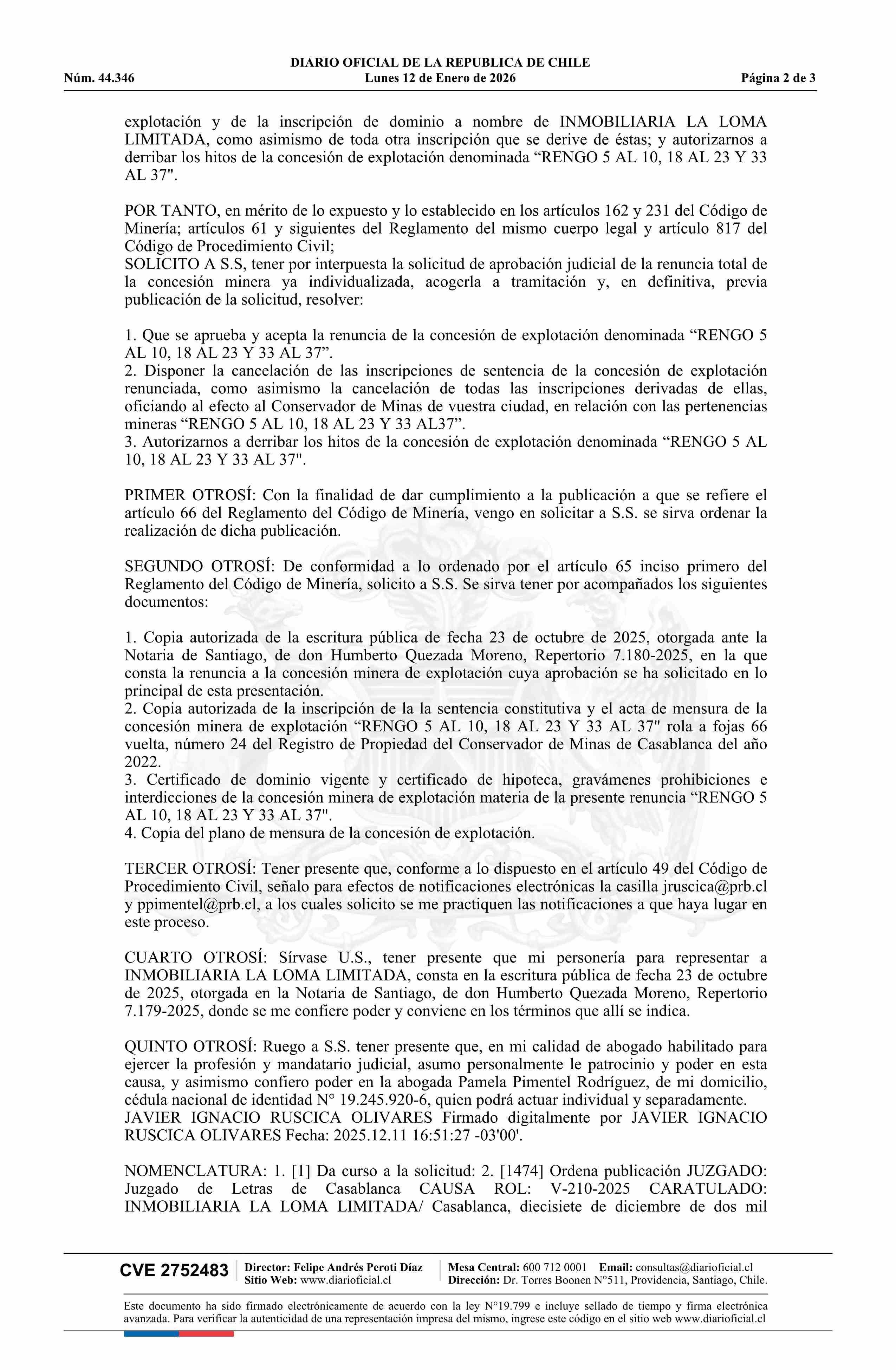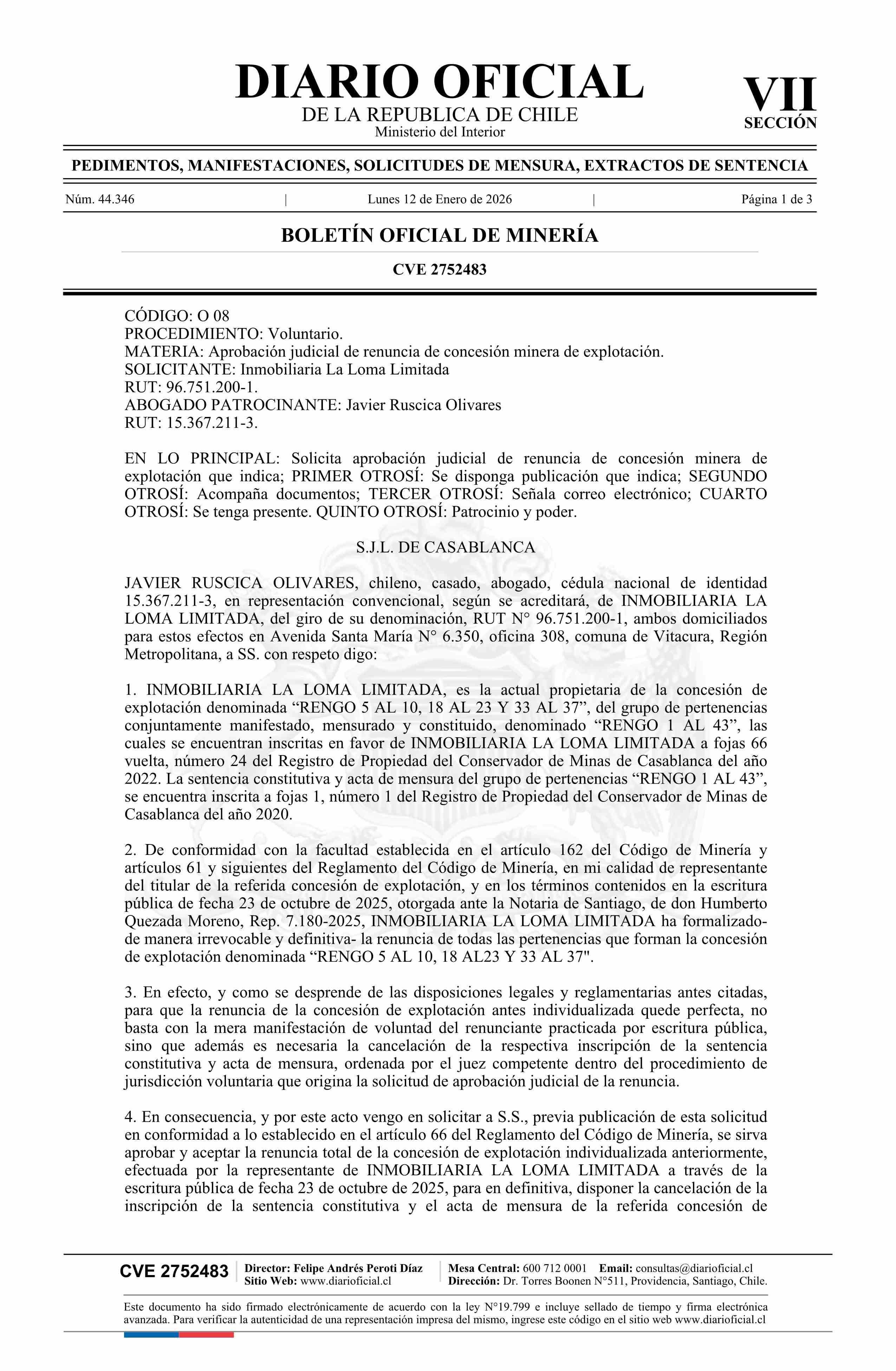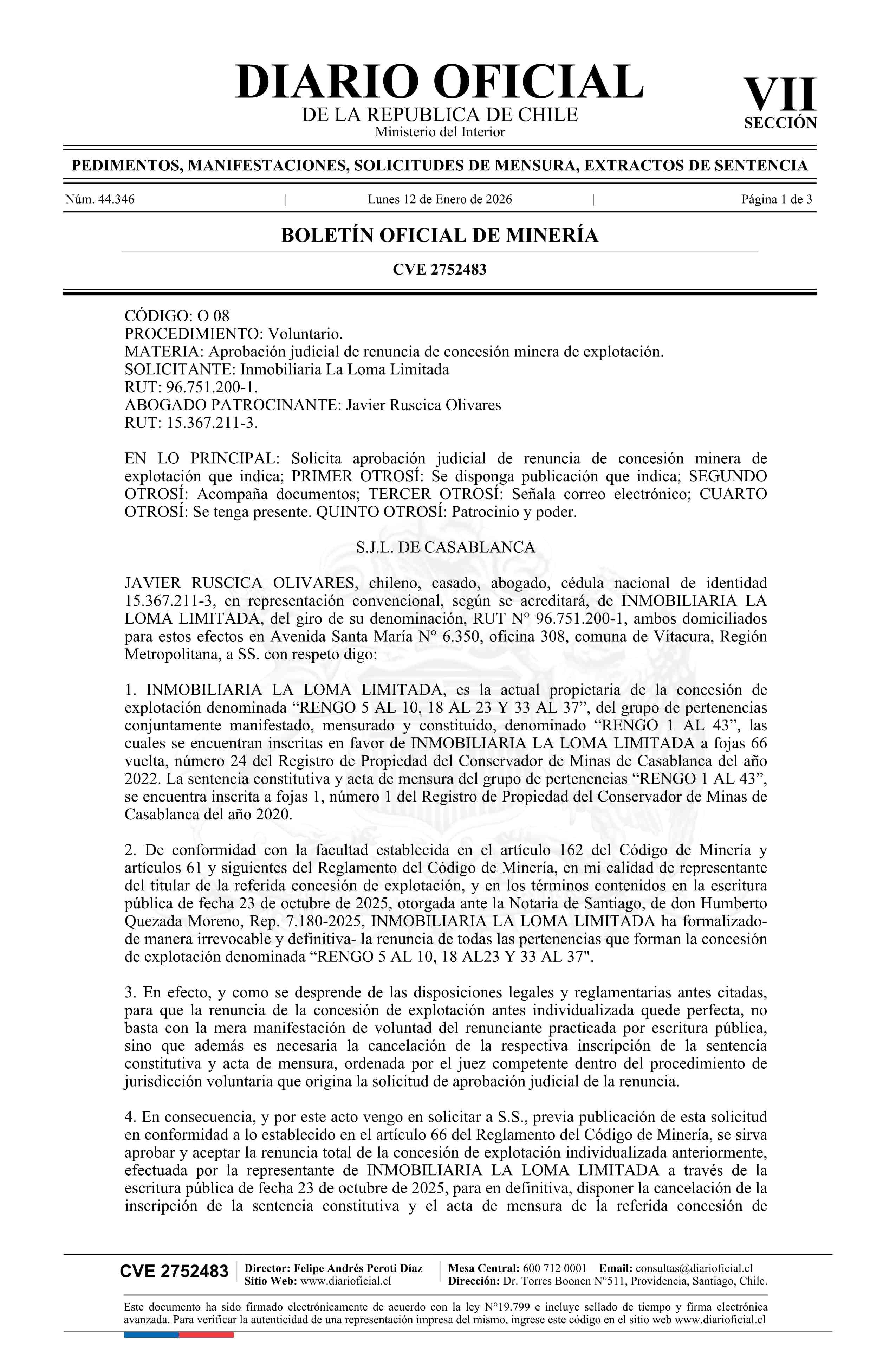 RENGO / Inmobiliaria La Loma Limitada 12-01-2026 DIARIO OFICIAL CHILE - BOLETÍN OFICIAL DE MINERÍA |