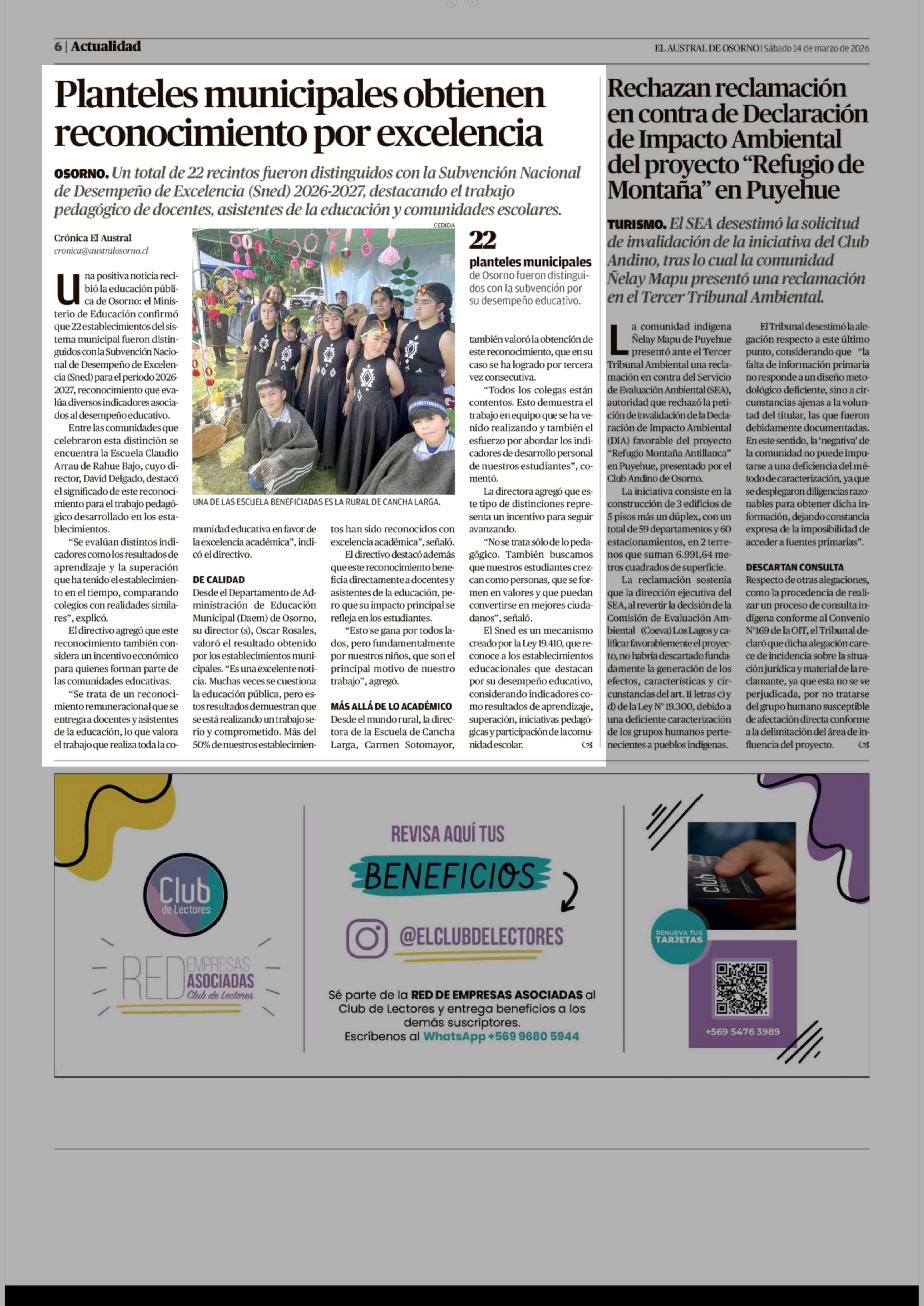 Planteles municipales obtienen reconocimiento por excelencia 14-03-2026 El Austral de Osorno |