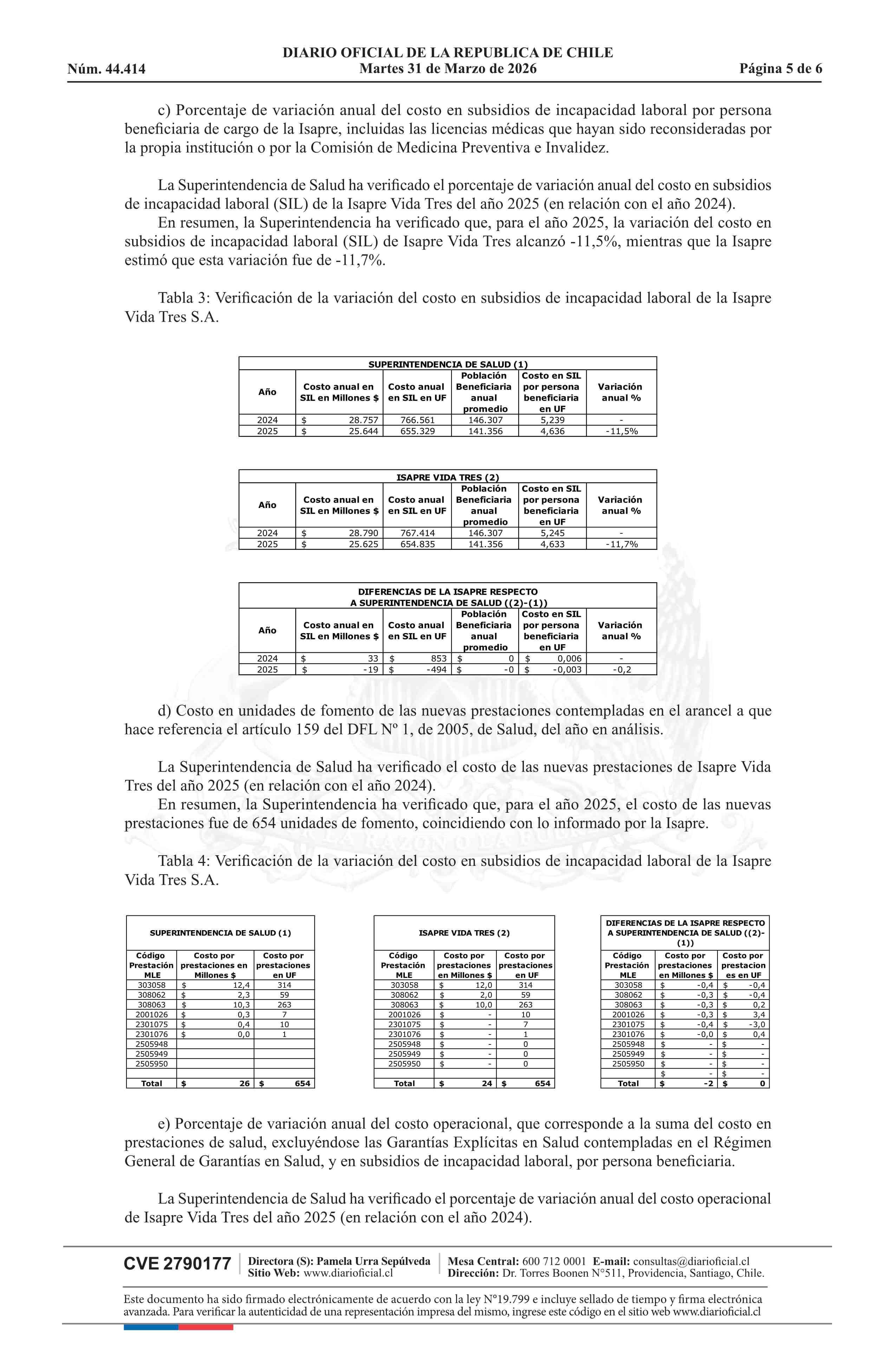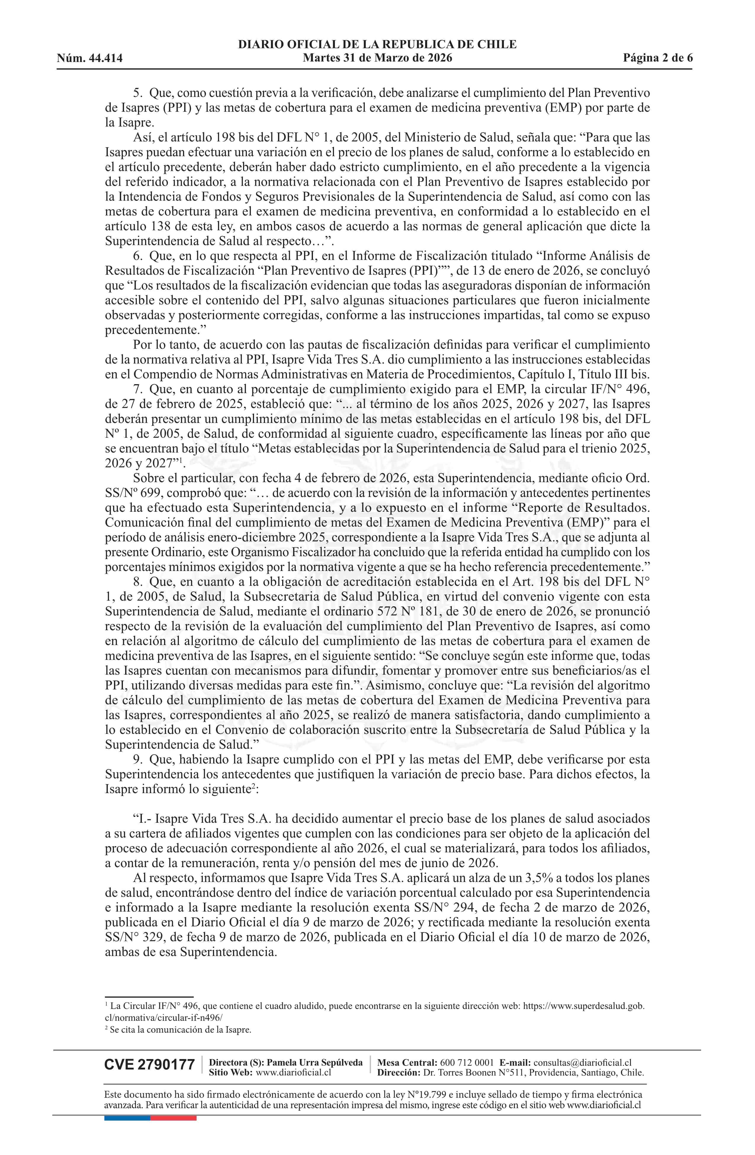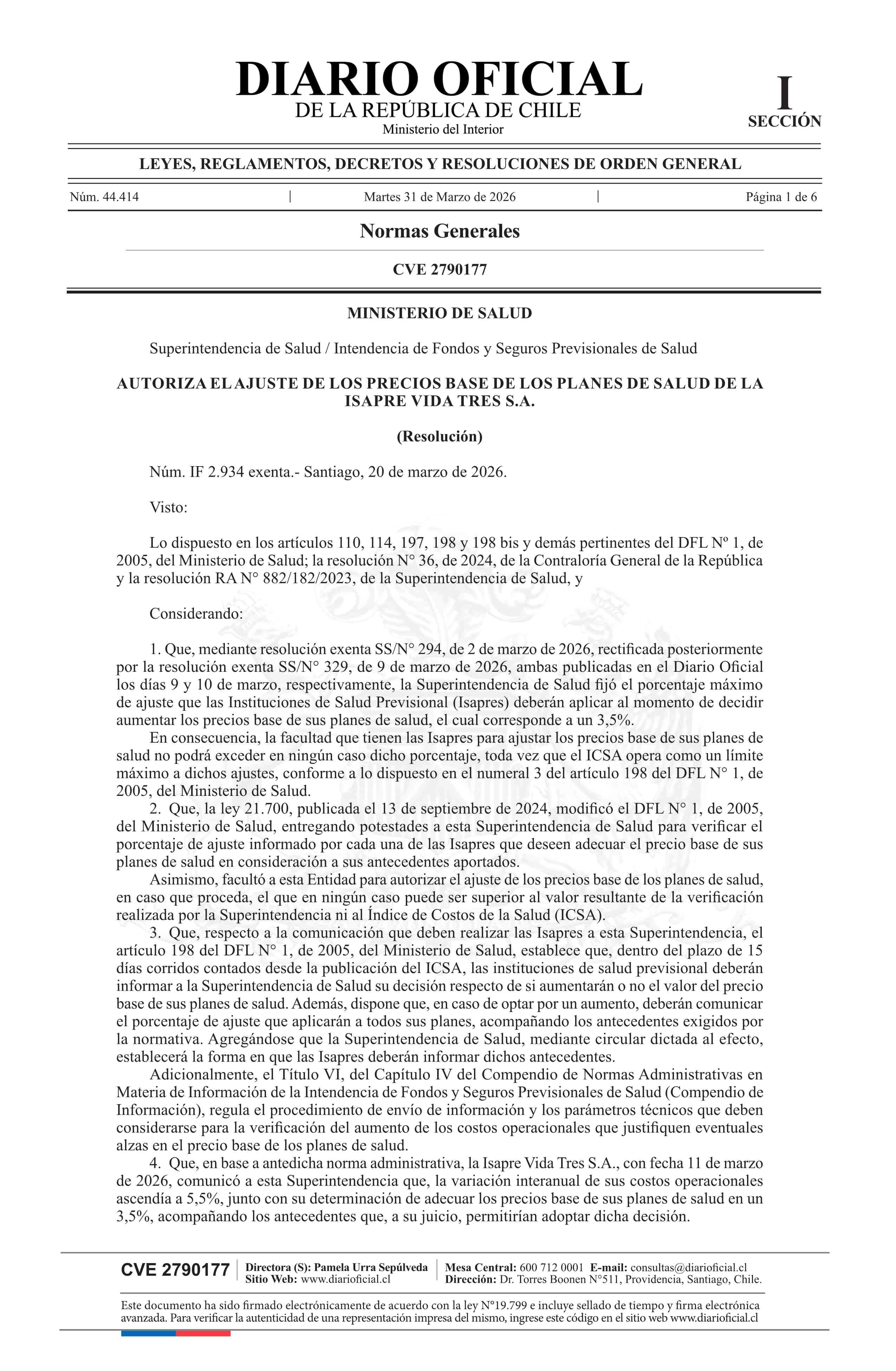 Resolución exenta número IF 2.934, de 2026.- Autoriza el ajuste de los precios base de los planes de salud de la Isapre Vida Tres S.A. 31-03-2026 Diario Oficial Edición Electrónica |