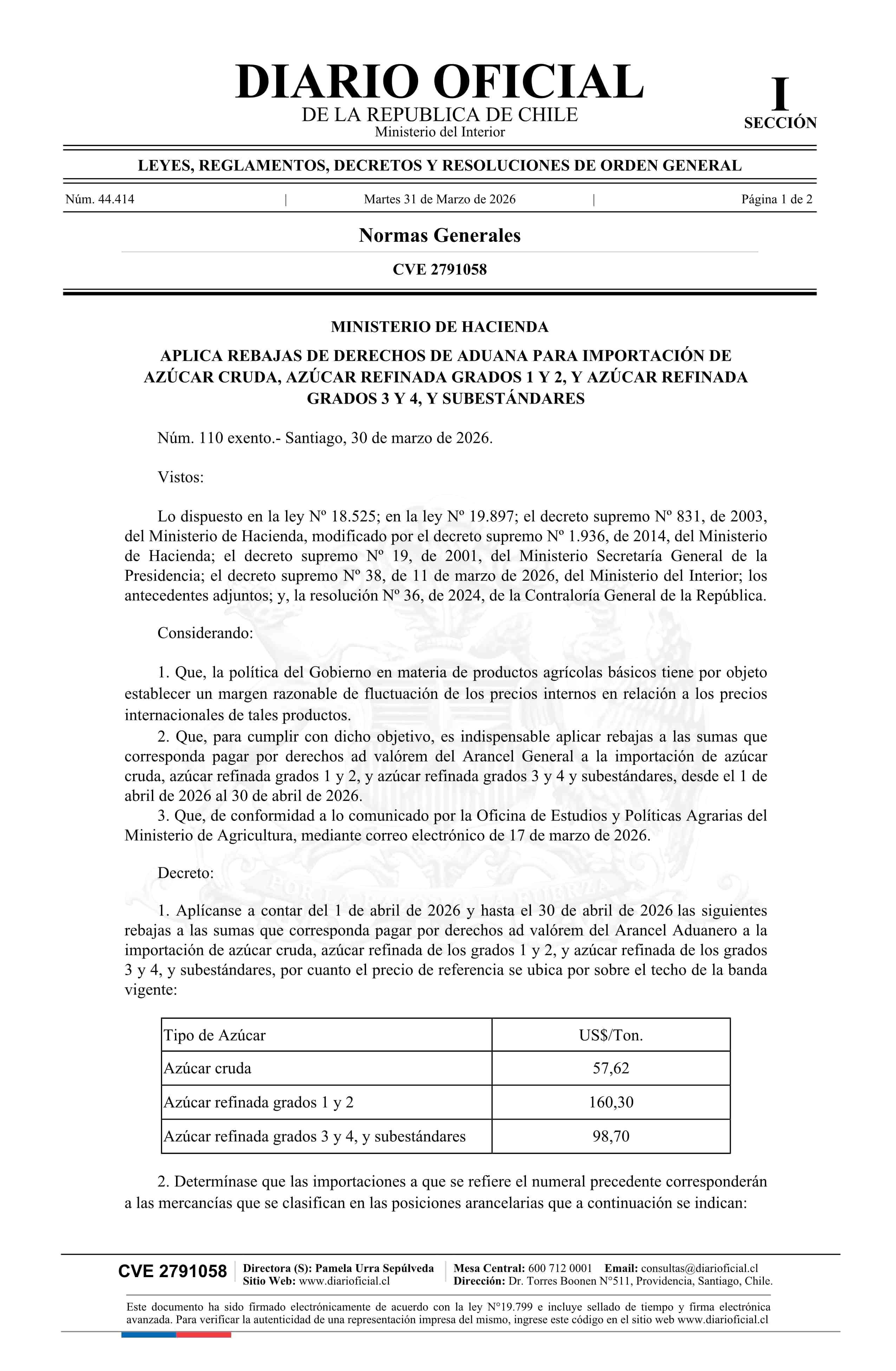 Título: Decreto exento número 110, de 2026.- Aplica rebajas de derechos de aduana para la importación de azúcar cruda, azúcar refinada grados 1 y 2, y azúcar refinada grados 3 y 4, y subestándares