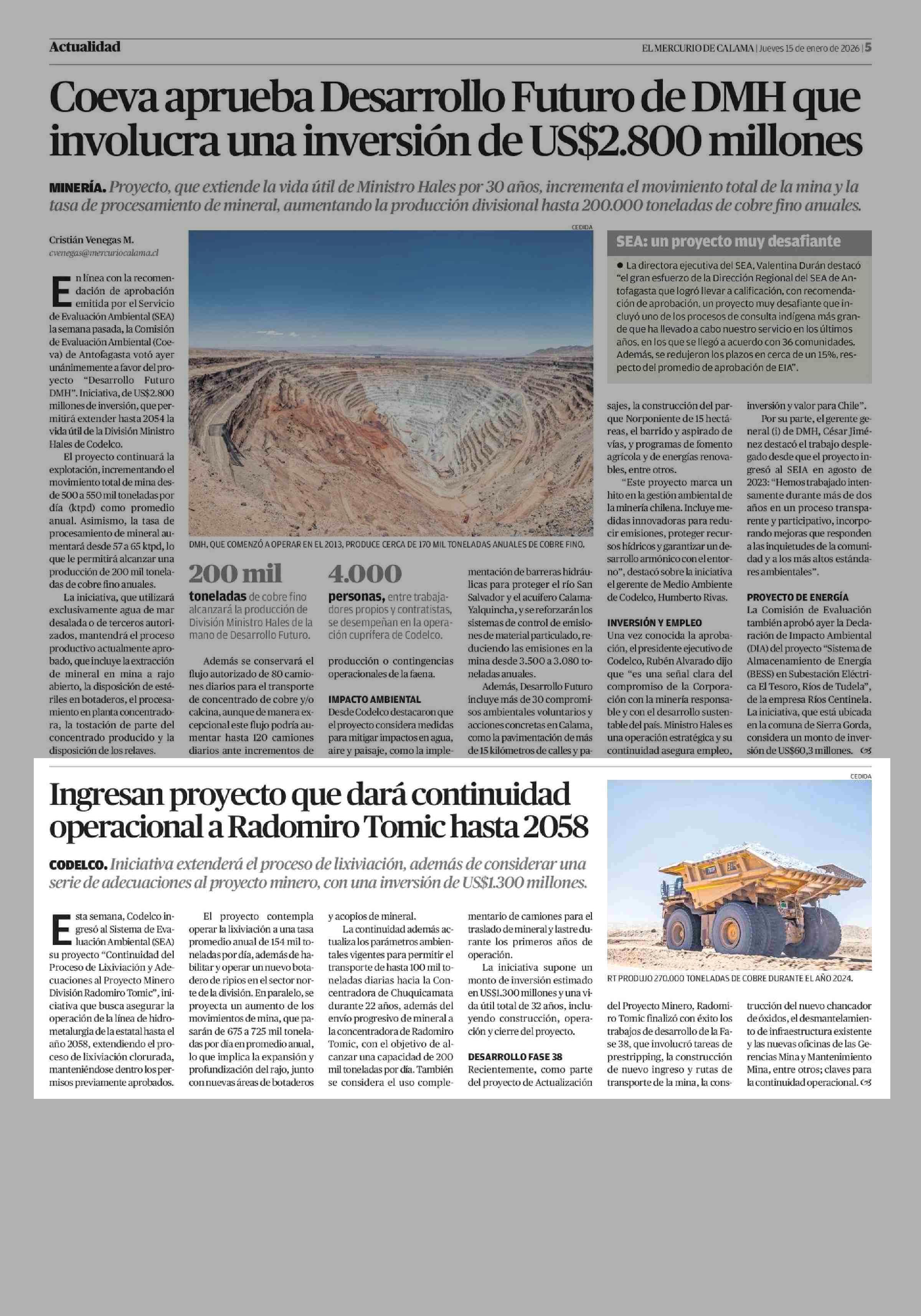Ingresan proyecto que dará continuidad operacional a Radomiro Tomic hasta 2058 15-01-2026 El Mercurio de Calama |