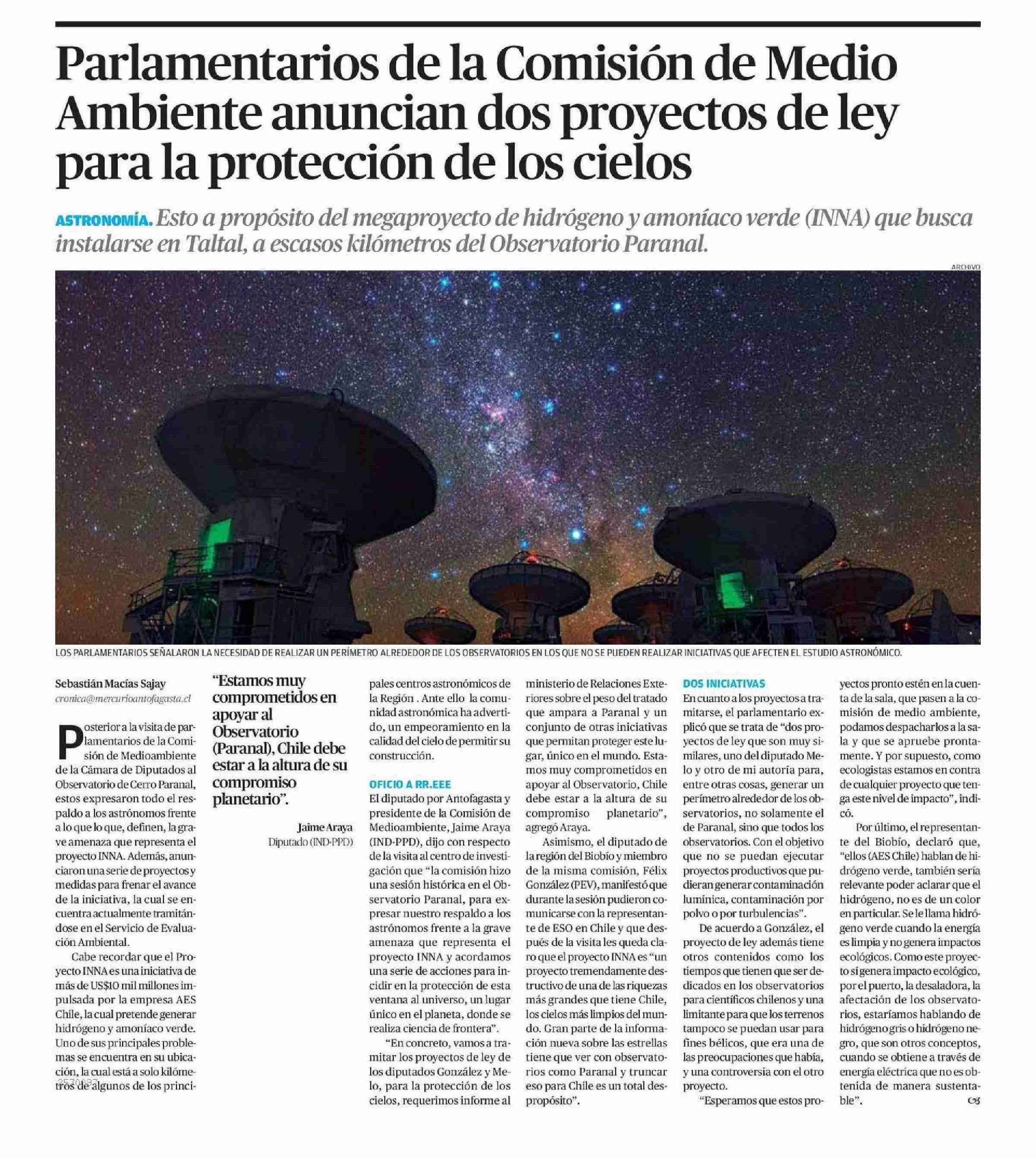 Parlamentarios de la Comisión de Medio Ambiente anuncian dos proyectos de ley para la protección de los cielos 15-06-2025 El Mercurio de Calama |