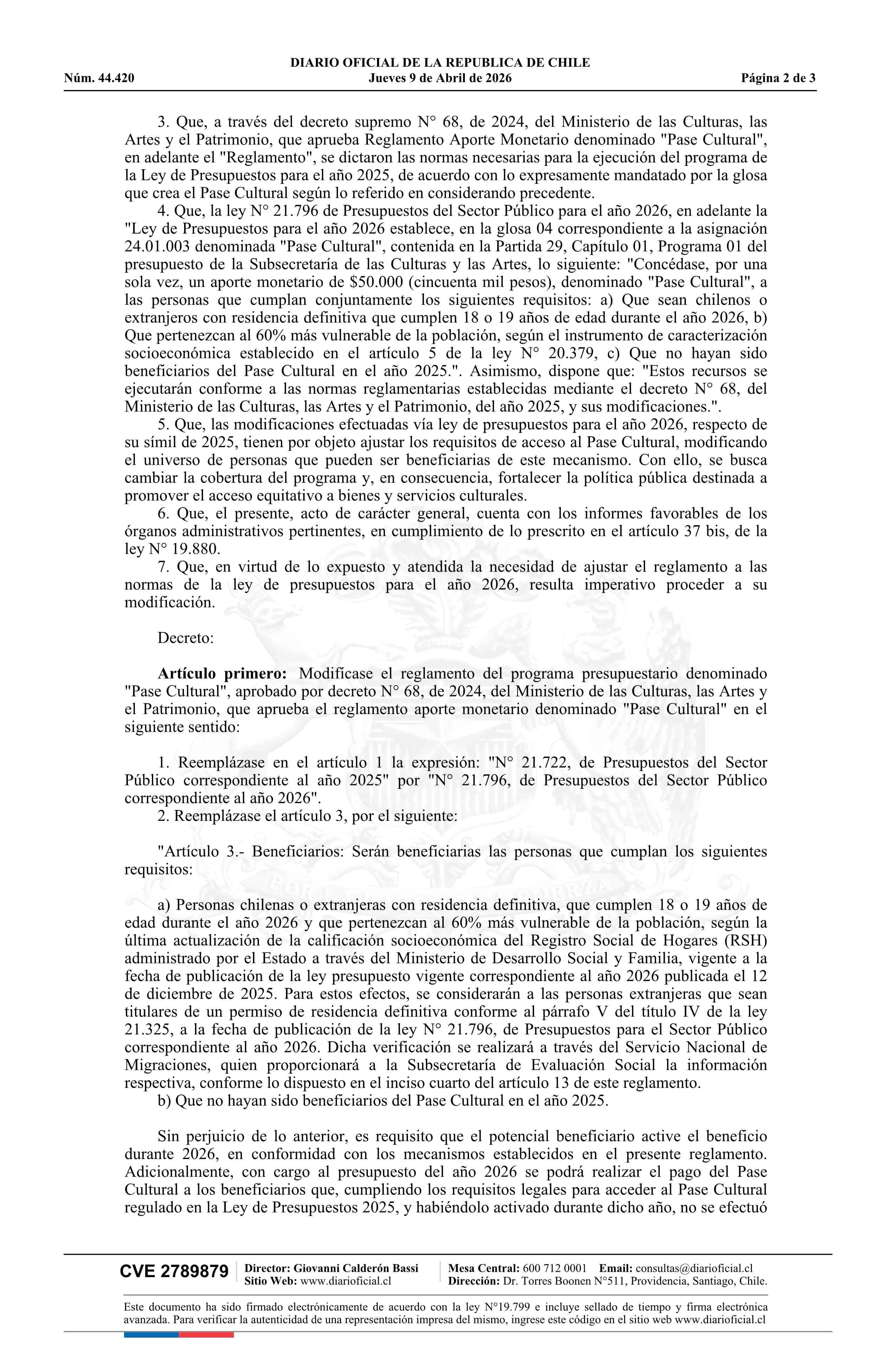 Decreto número 1, de 2026.- Modifica decreto N° 68, de 2024, que aprueba Reglamento Aporte Monetario denominado Pase Cultural 09-04-2026 Diario Oficial Edición Electrónica |