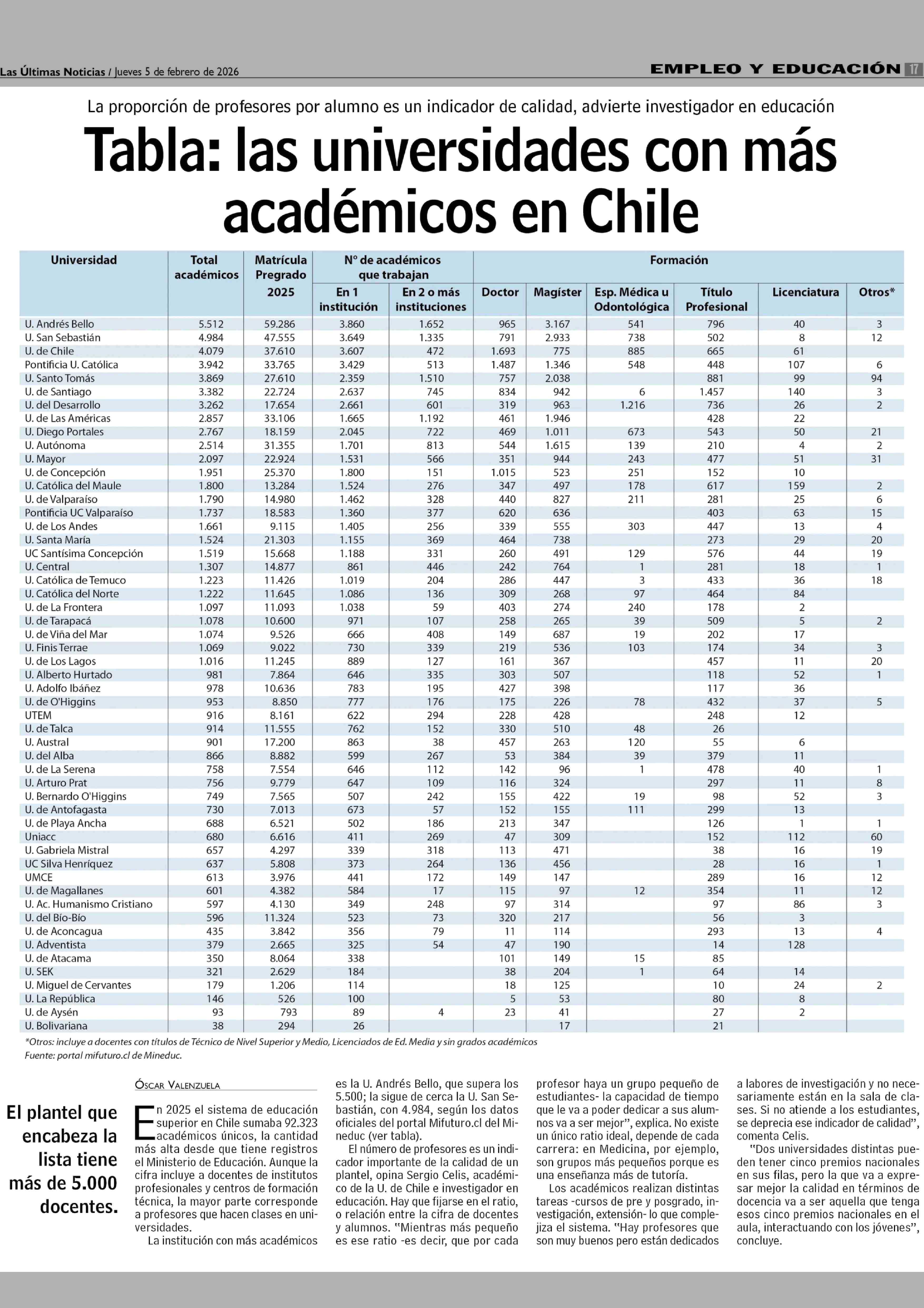 Tabla: las universidades con más académicos en Chile 05-02-2026 Las Últimas Noticias |