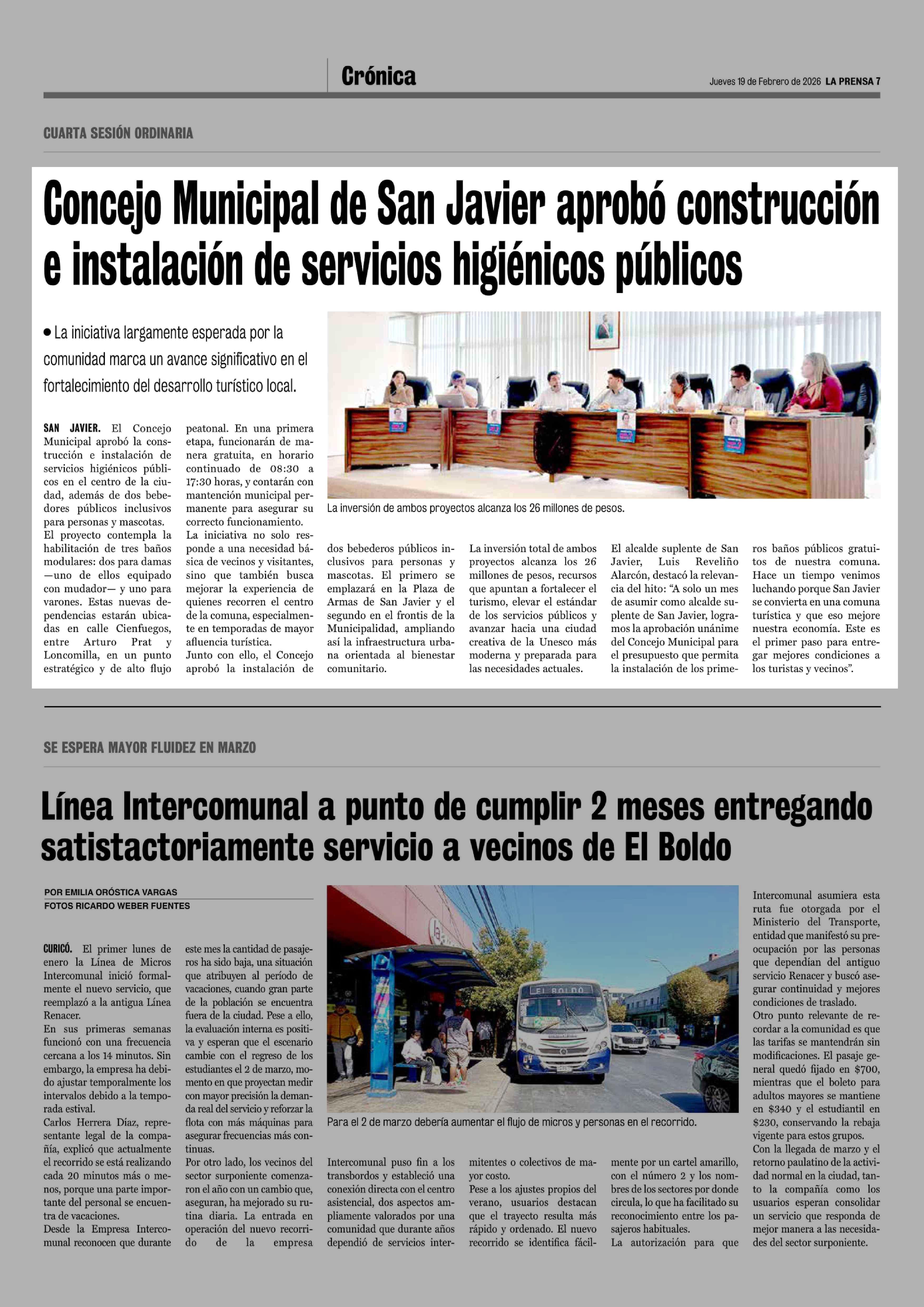 Concejo Municipal de San Javier aprobó construcción e instalación de servicios higiénicos públicos 19-02-2026 La Prensa de Curicó |
