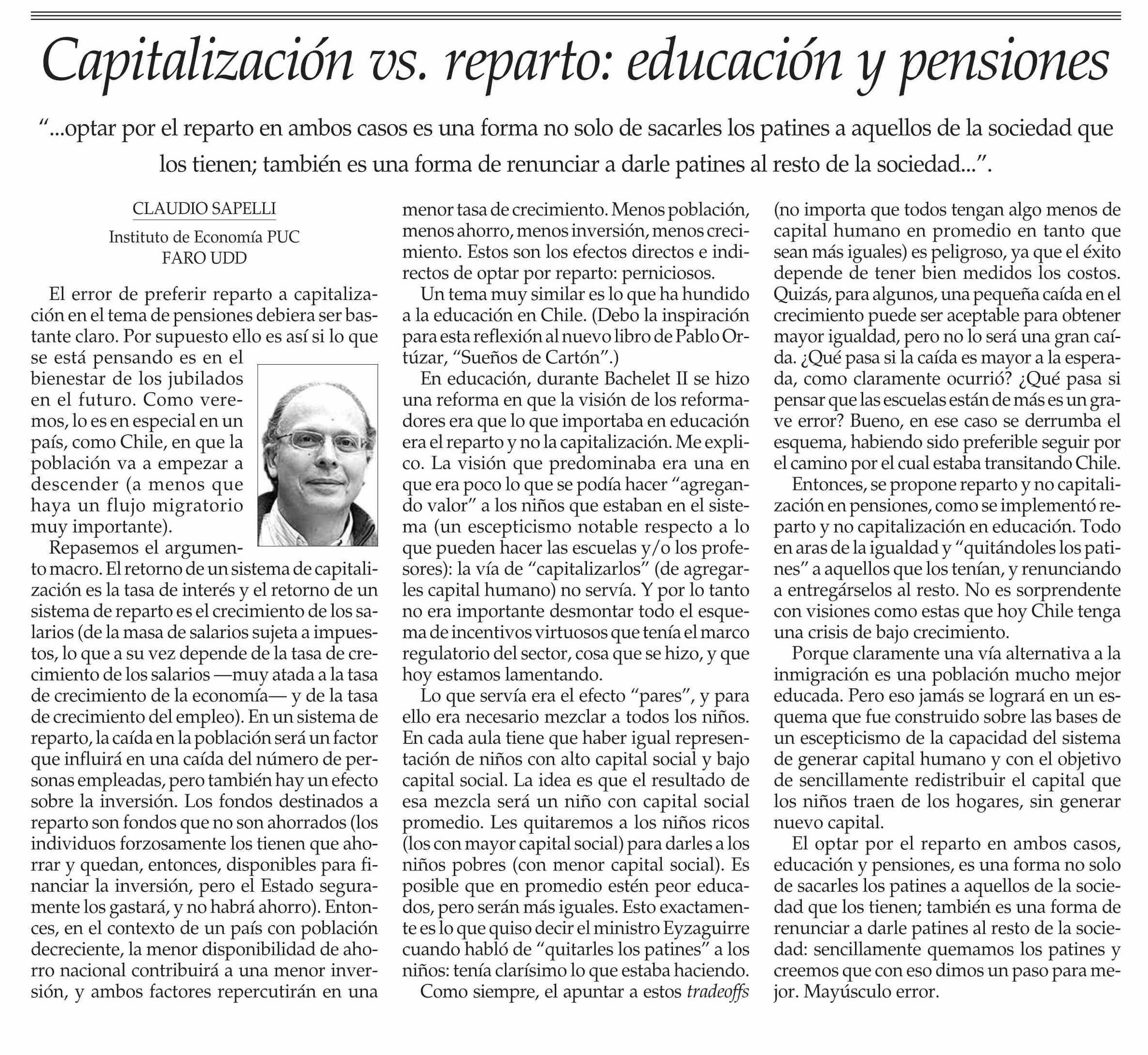 Capitalización vs. reparto: educación y pensiones 17-01-2024 El Mercurio |