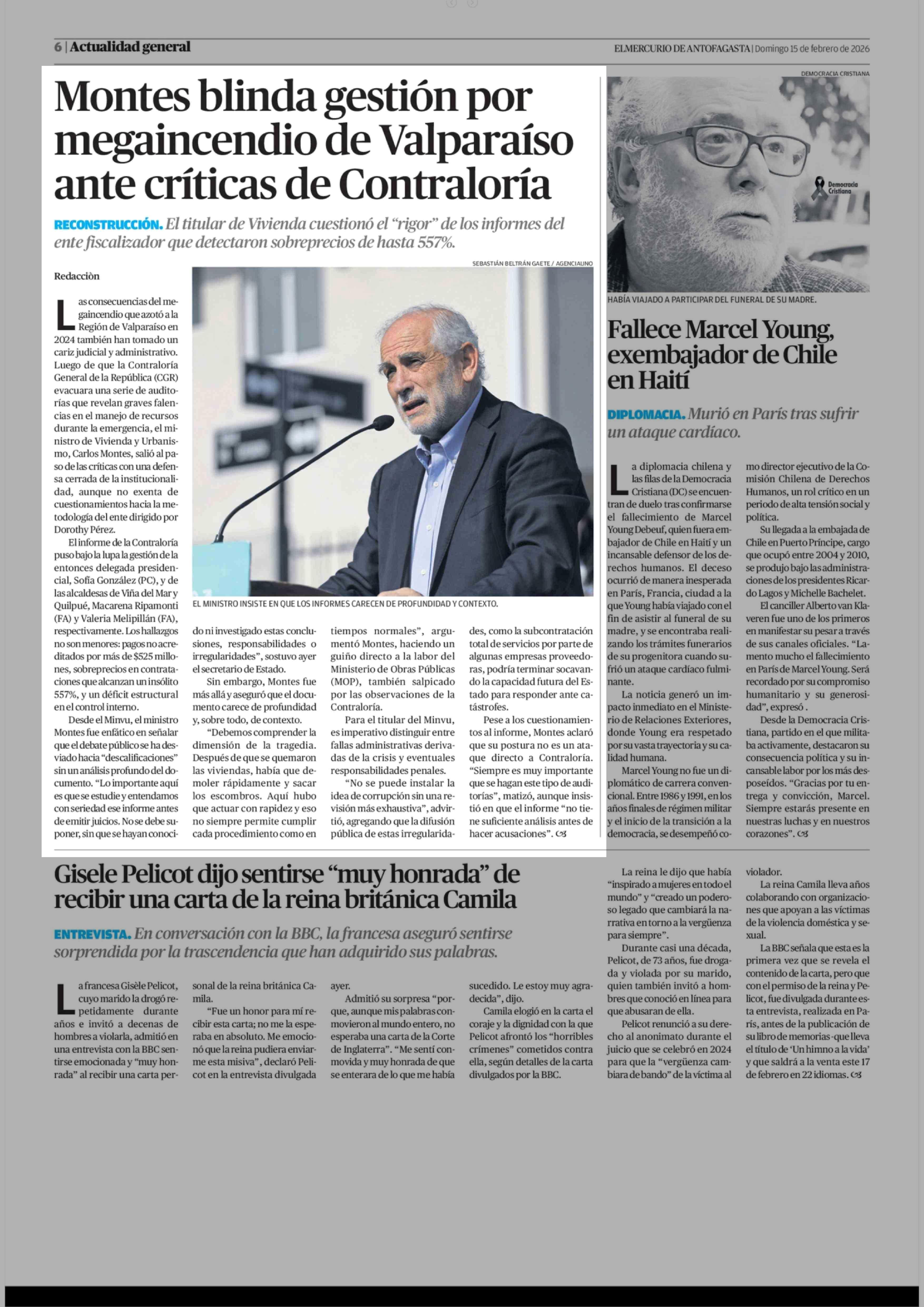 Montes blinda gestión por megaincendio de Valparaíso ante críticas de Contraloría 15-02-2026 El Mercurio de Antofagasta |