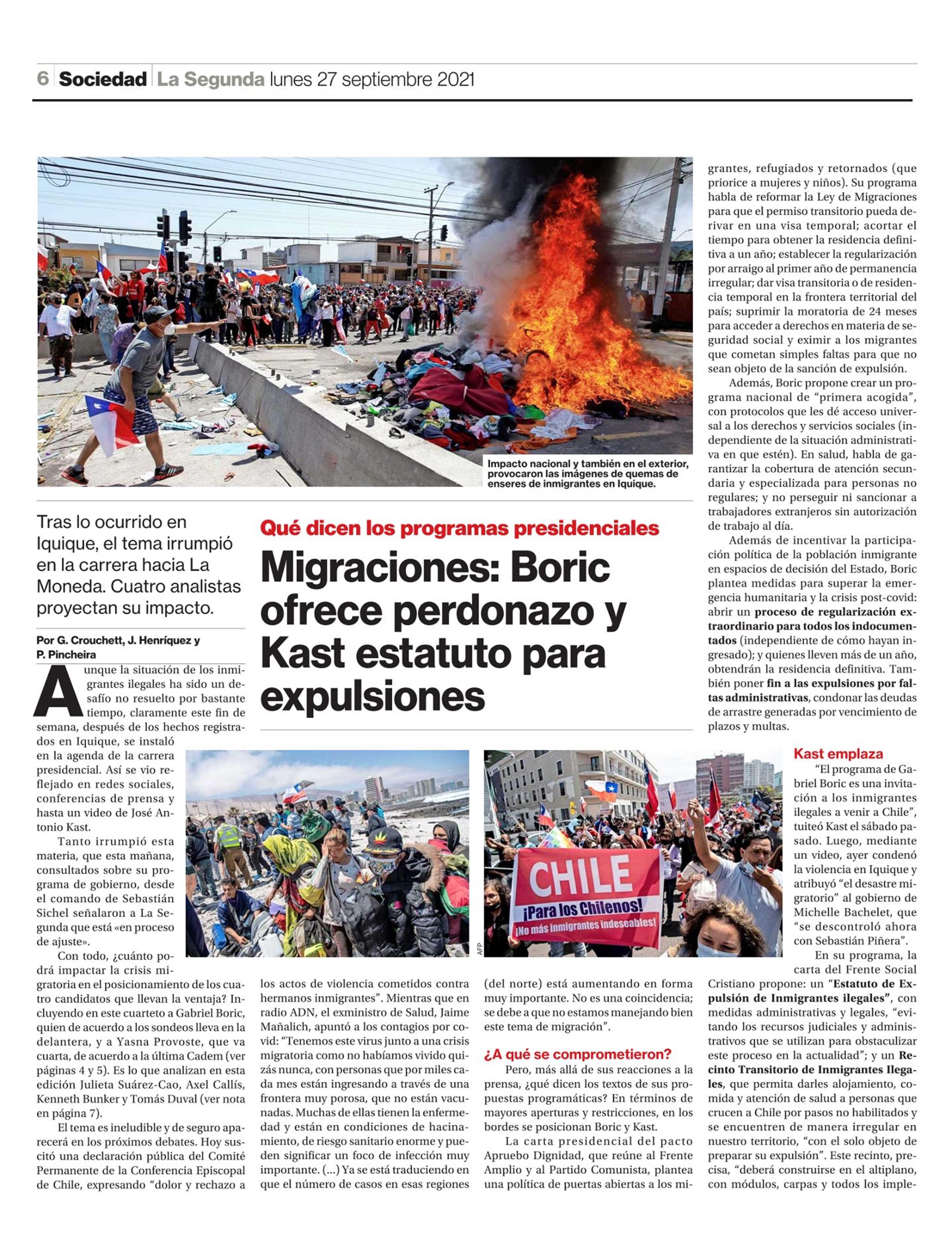 Migraciones: Boric ofrece perdonazo y Kast estatuto para expulsiones 27-09-2021 La Segunda |