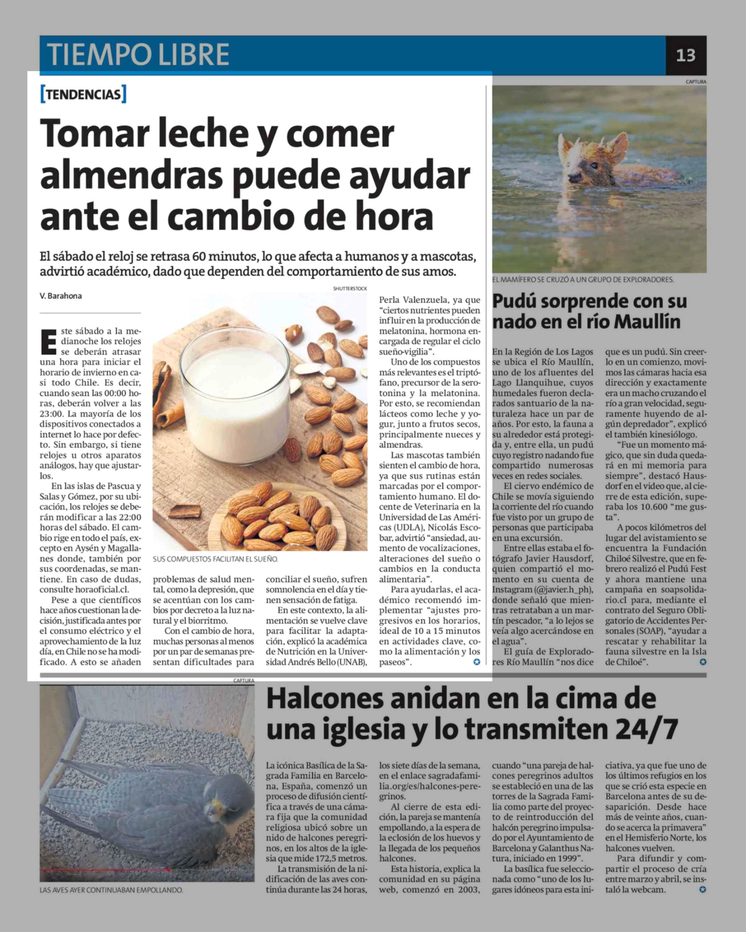 Tomar leche y comer almendras puede ayudar ante el cambio de hora 02-04-2026 La Estrella de Iquique |