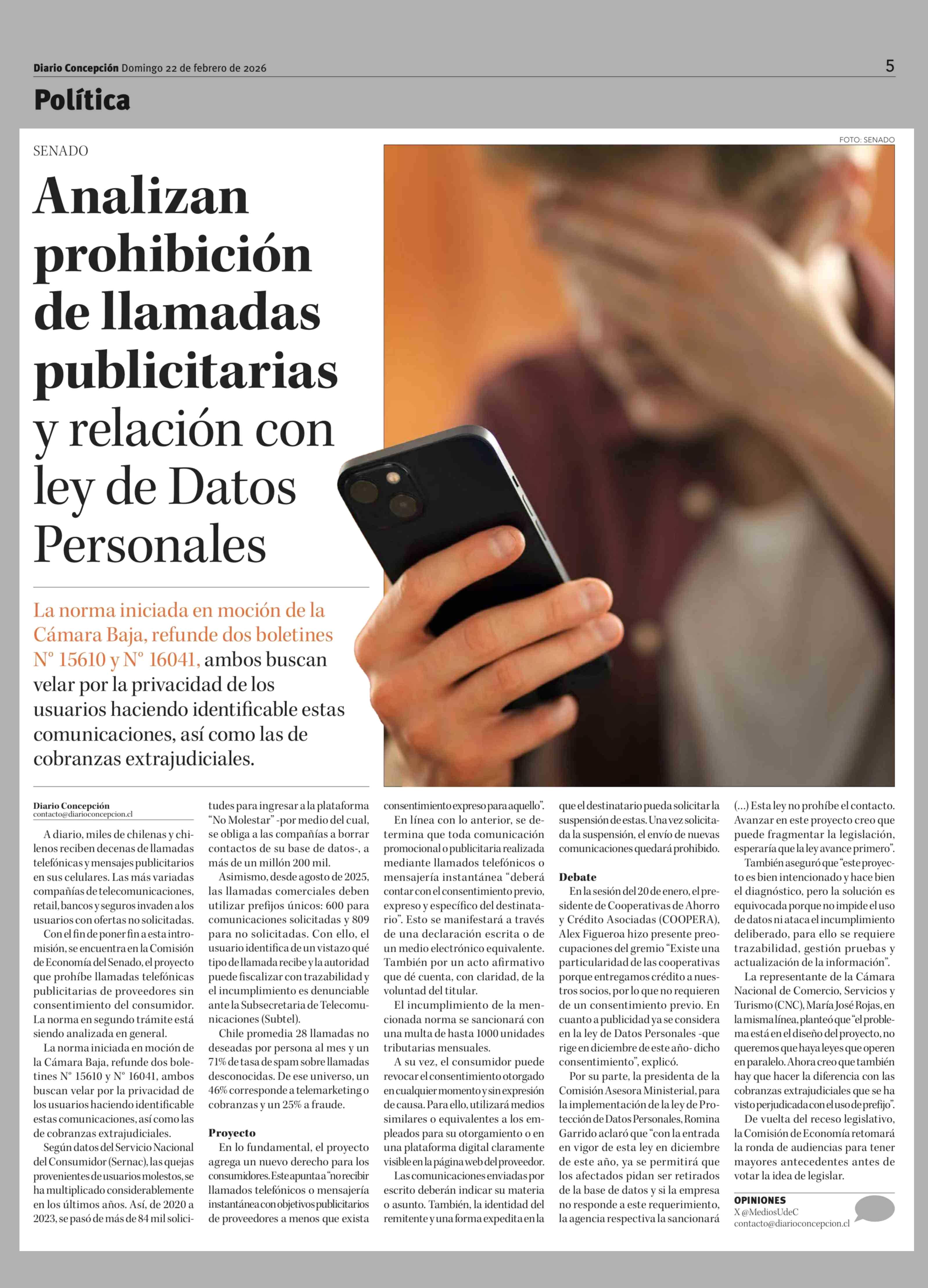 Analizan prohibición de llamadas publicitarias y relación con ley de Datos Personales 22-02-2026 Diario Concepción |