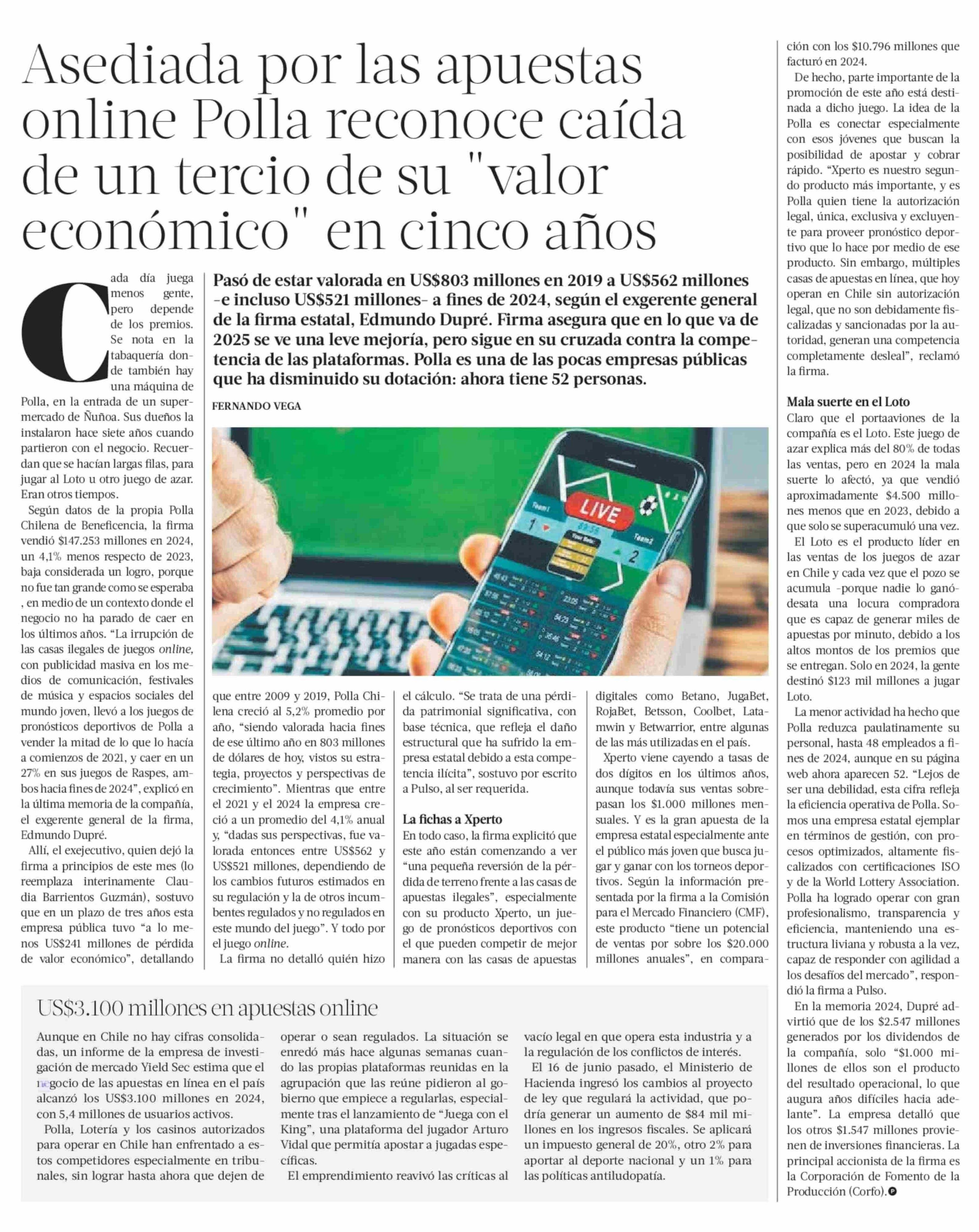 Asediada por las apuestas online Polla reconoce caída de un tercio de su “valor económico” en cinco años 21-06-2025 La Tercera |