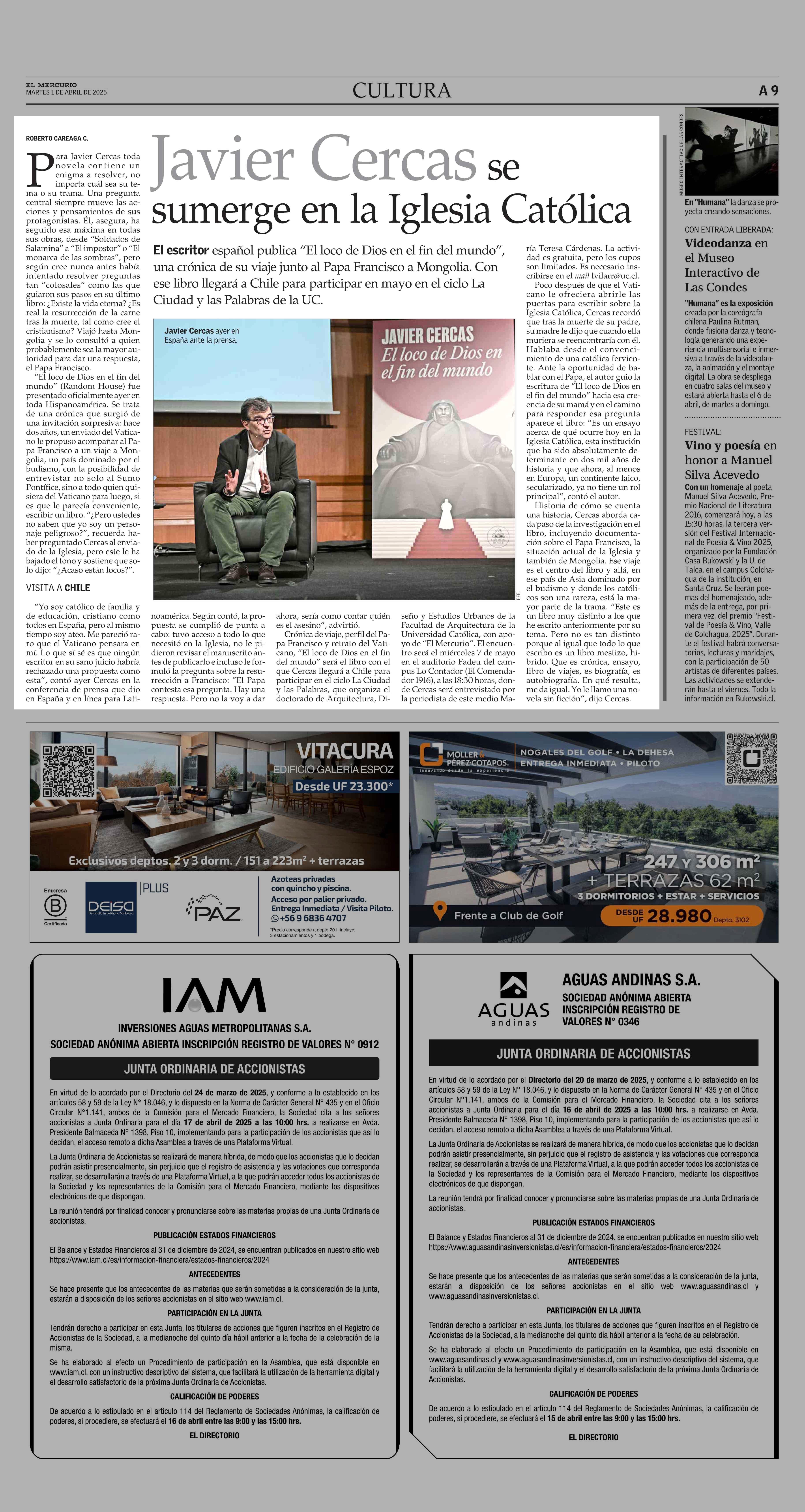 Javier Cercas se sumerge en la Iglesia Católica 01-04-2025 El Mercurio |