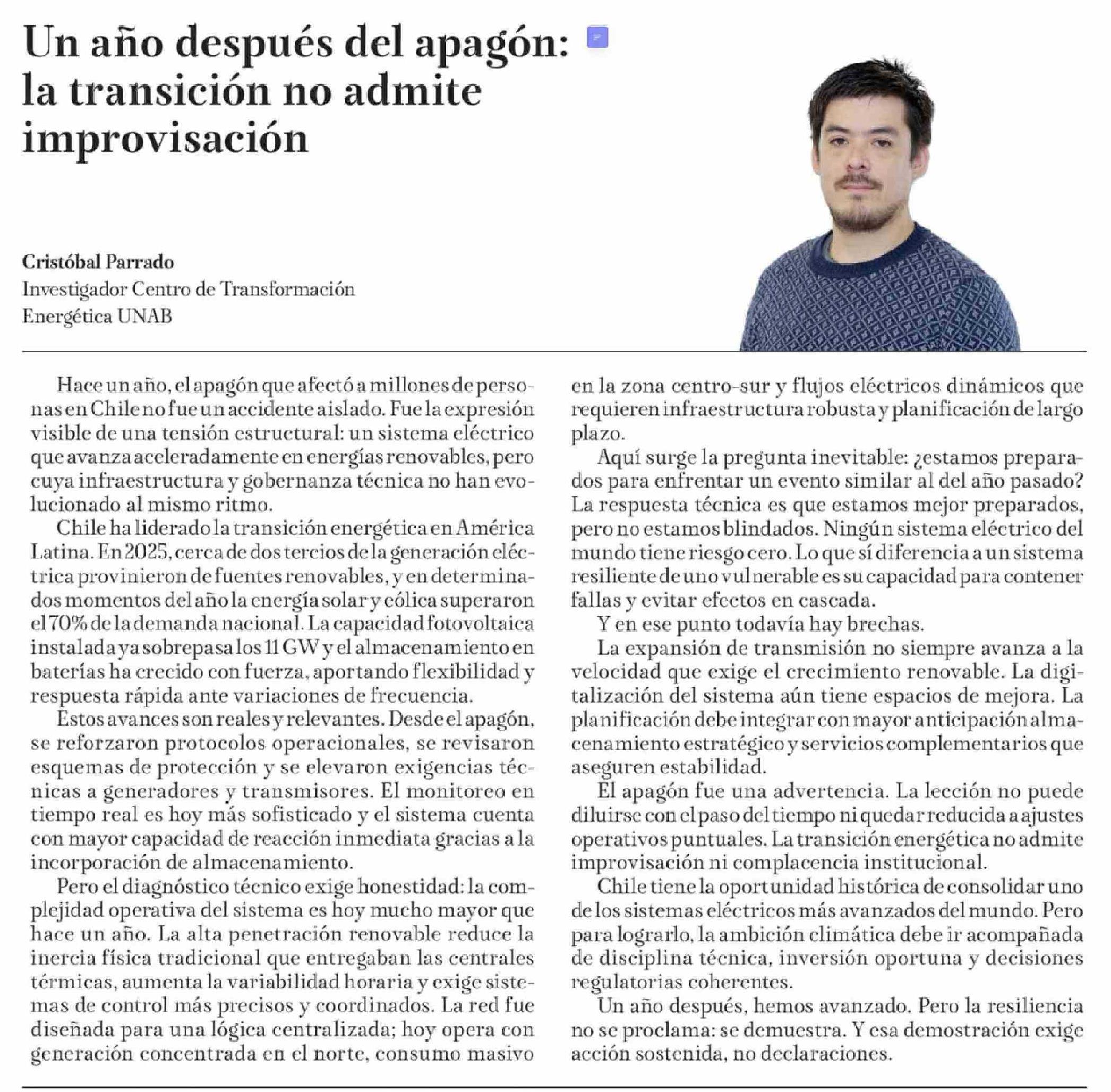 Título: Columnas de Opinión: Un año después del apagón: la transición no admite improvisación