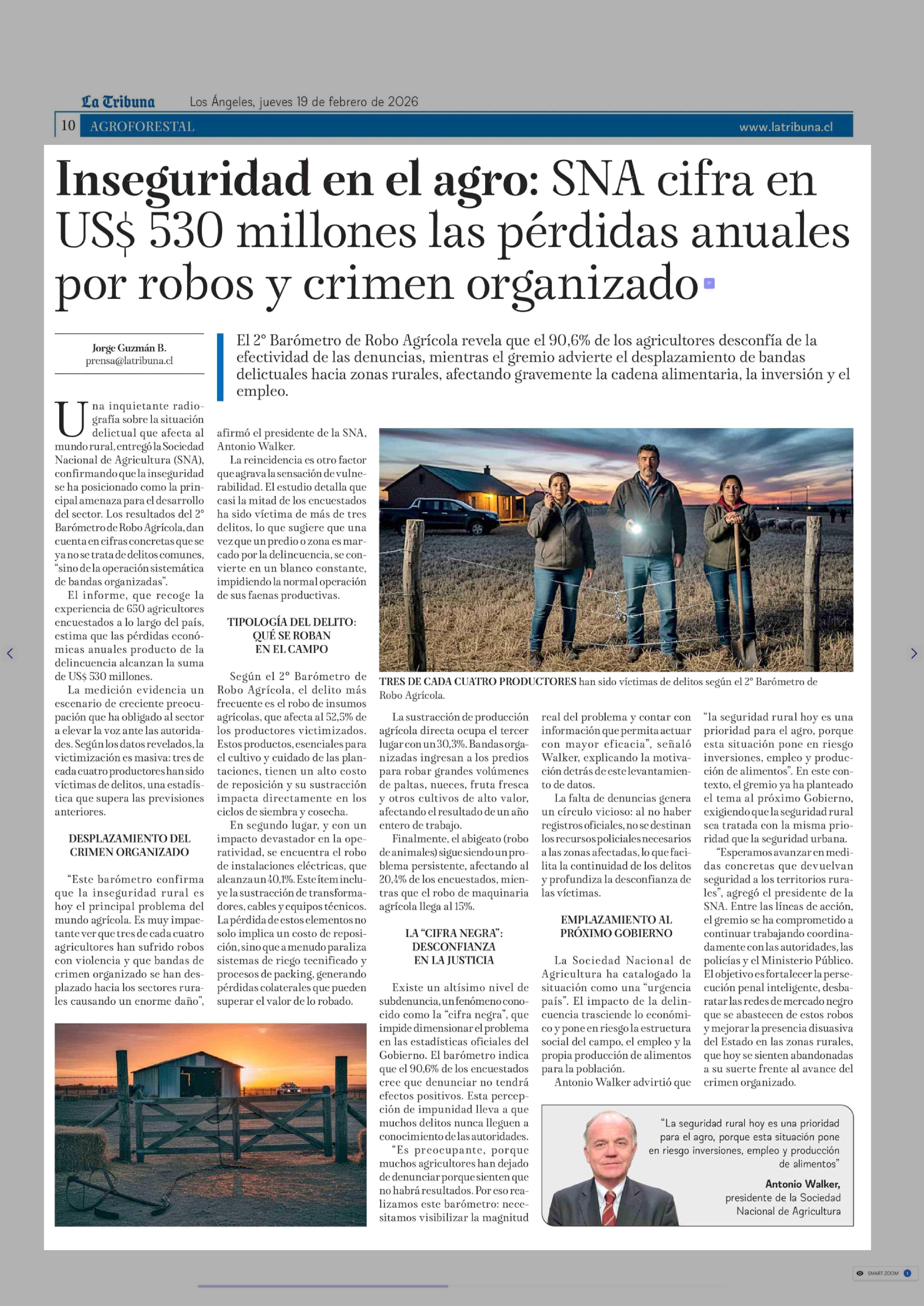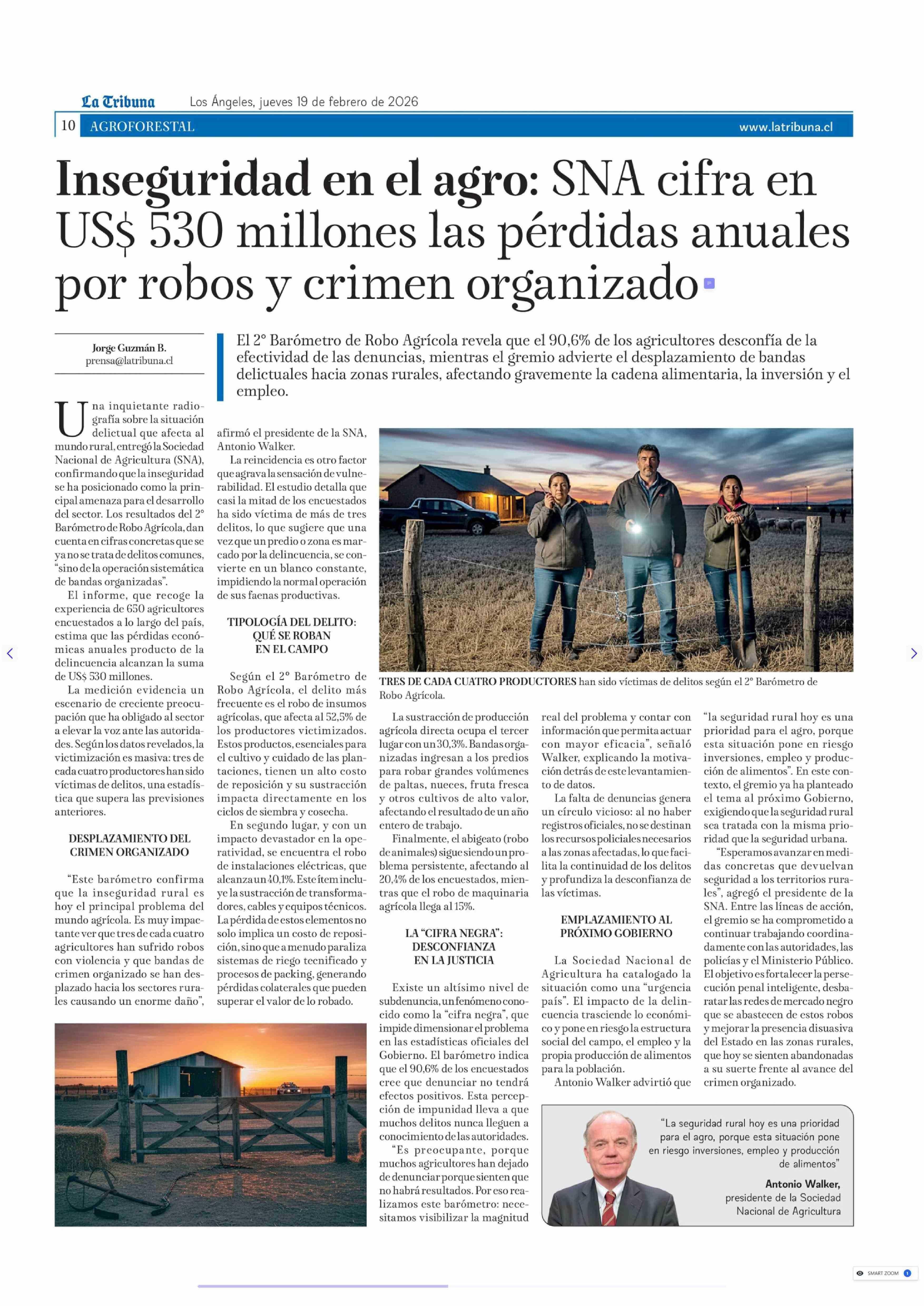 Inseguridad en el agro: SNA cifra en US$ 530 millones las pérdidas anuales por robos y crimen organizado 19-02-2026 La Tribuna |