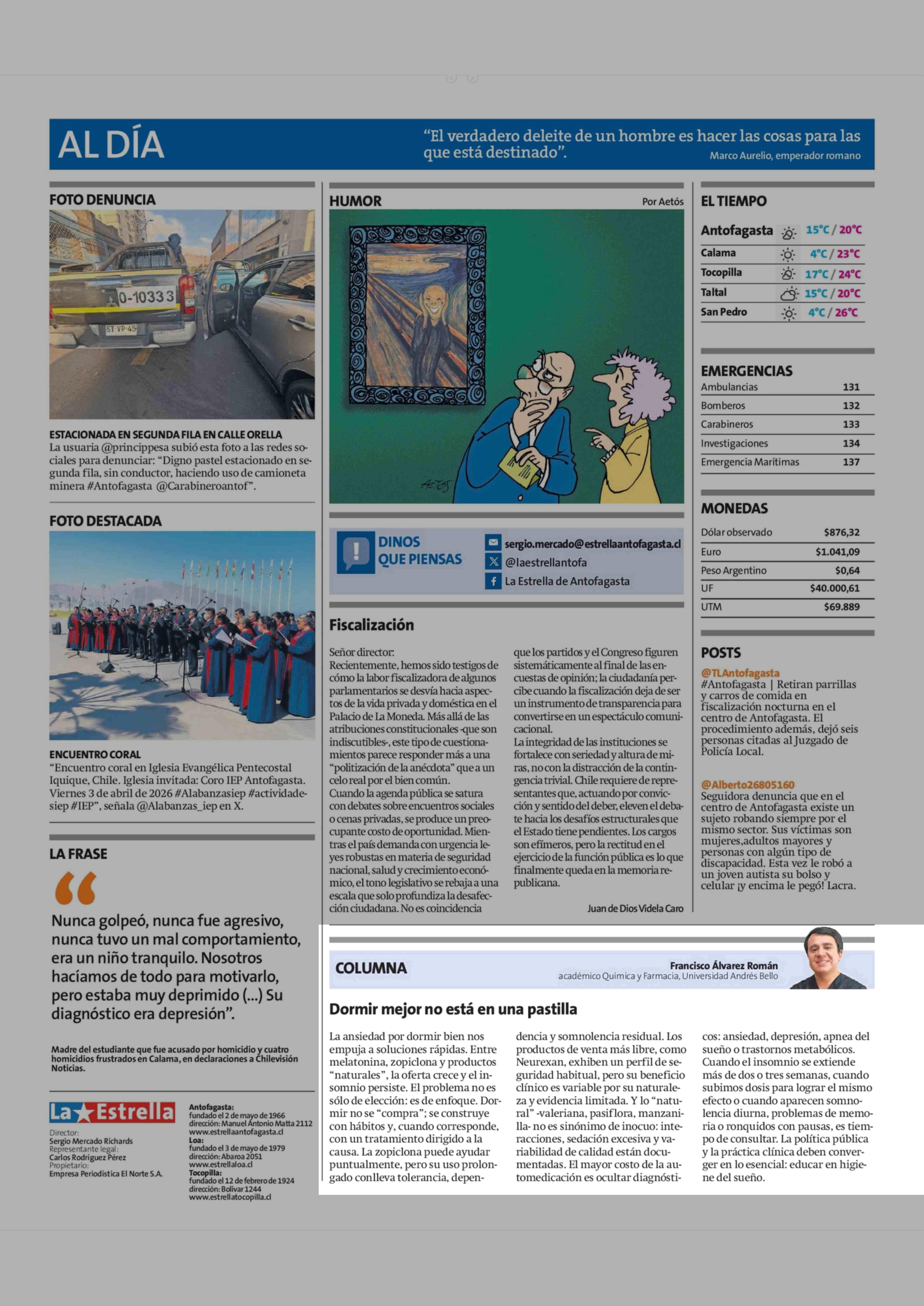 COLUMNAS DE OPINIÓN: Dormir mejor no está en una pastilla 21-04-2026 La Estrella de Antofagasta |