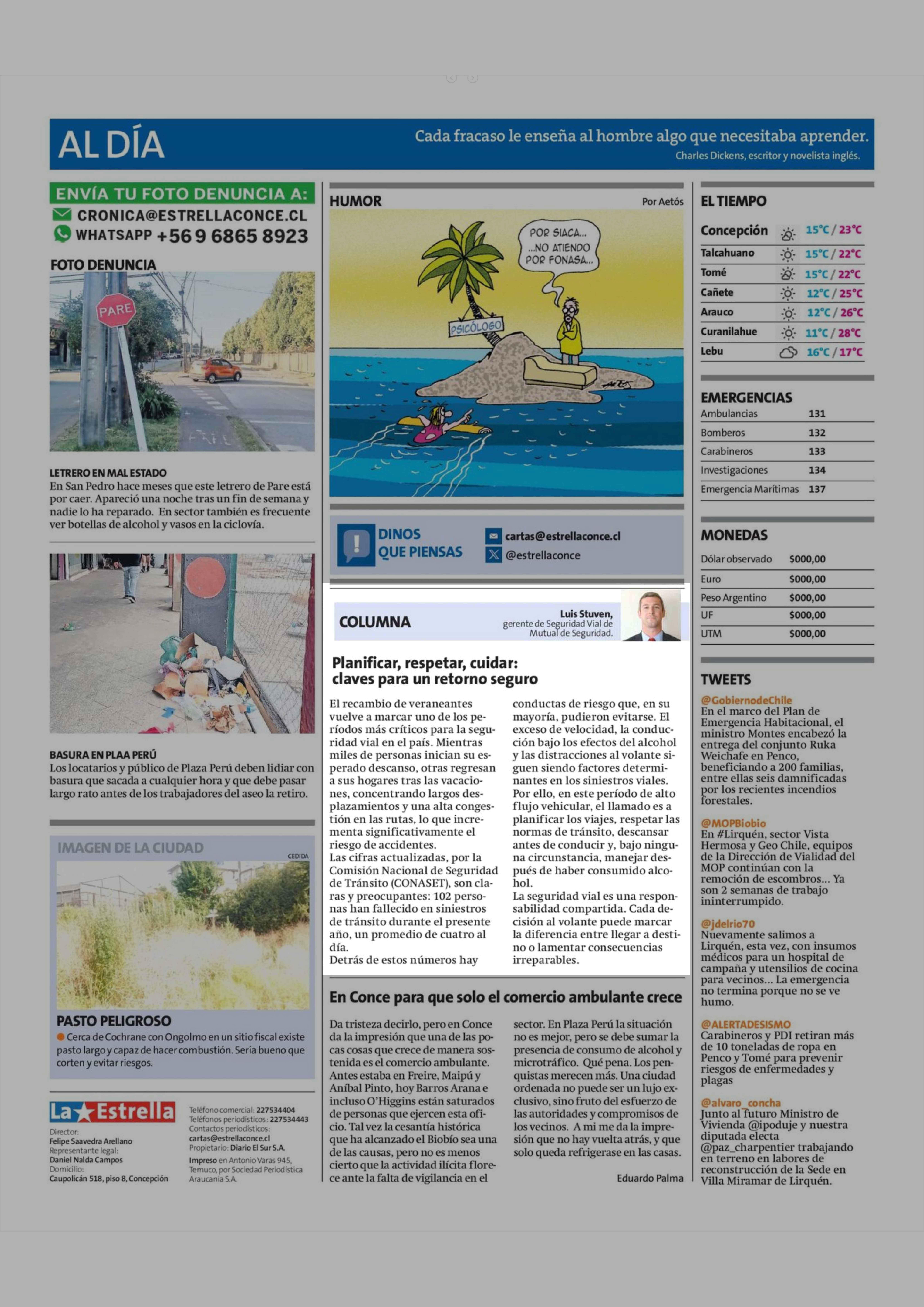Columnas de Opinión: Planificar, respetar, cuidar: claves para un retorno seguro 02-02-2026 La Estrella de Concepción |