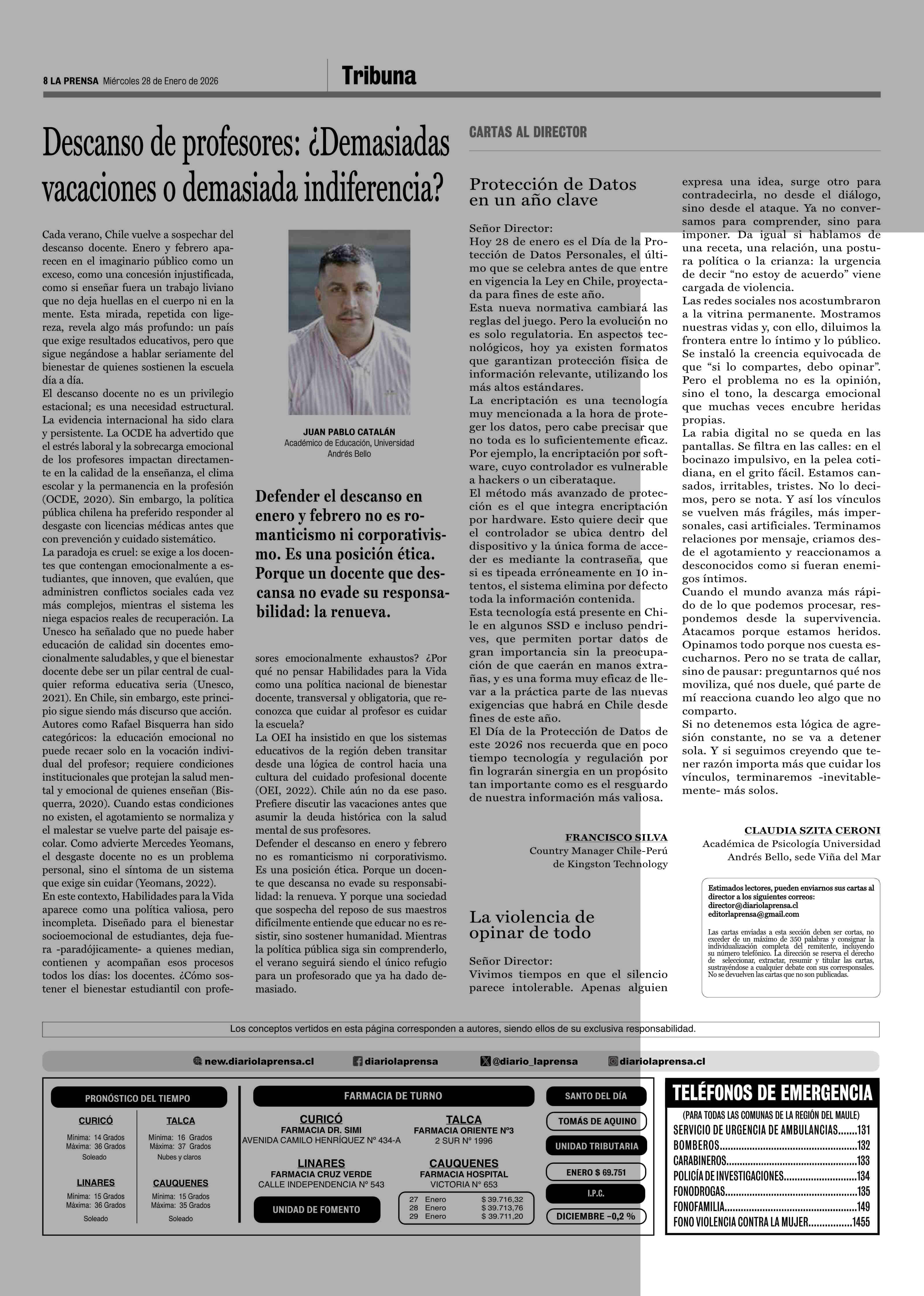 Cartas: La violencia de opinar de todo 28-01-2026 La Prensa de Curicó |