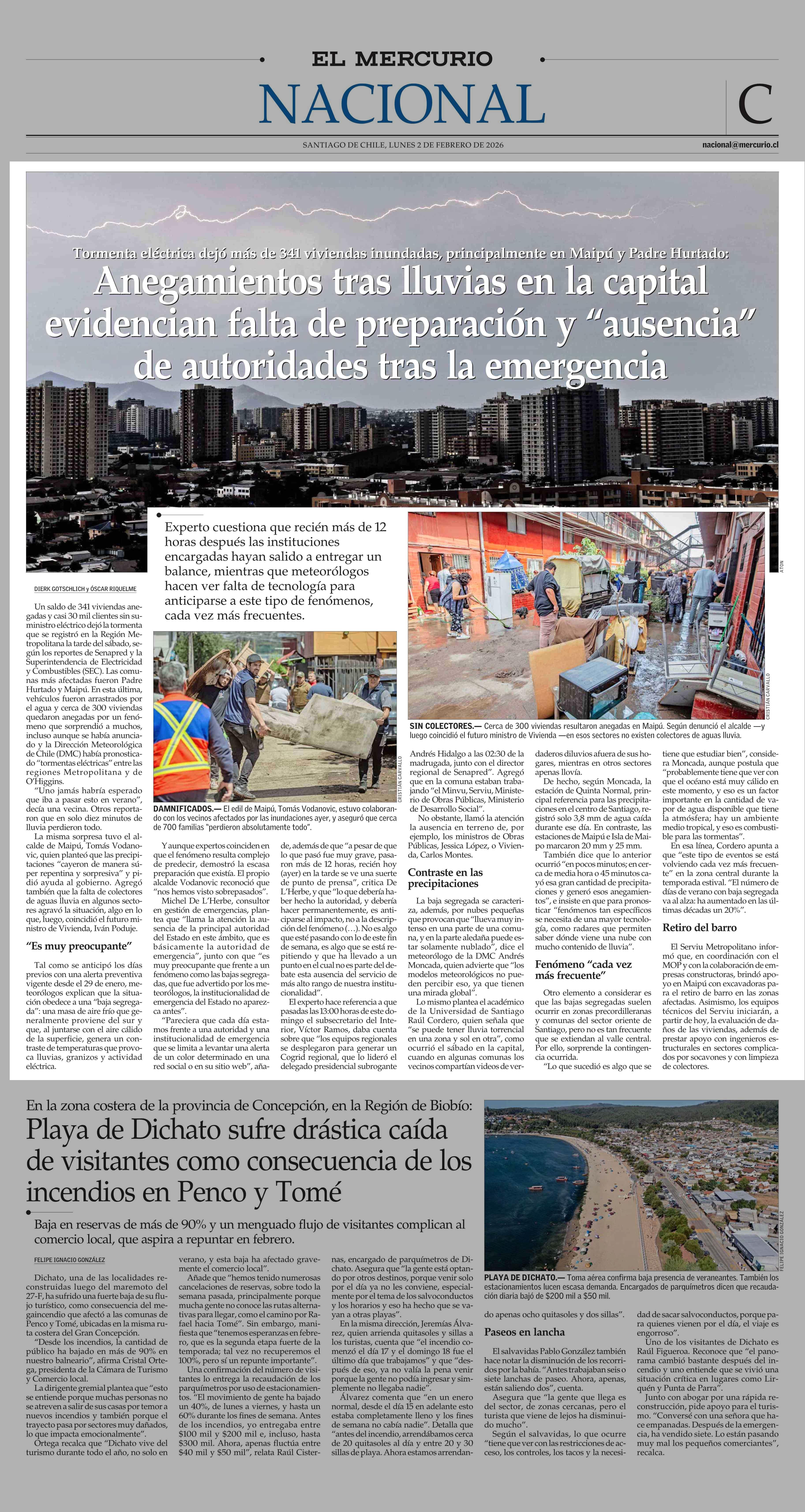 Anegamientos trás lluvias en la capital evidencian falta de preparación y “ausencia” de autoridades tras la emergencia 02-02-2026 El Mercurio |