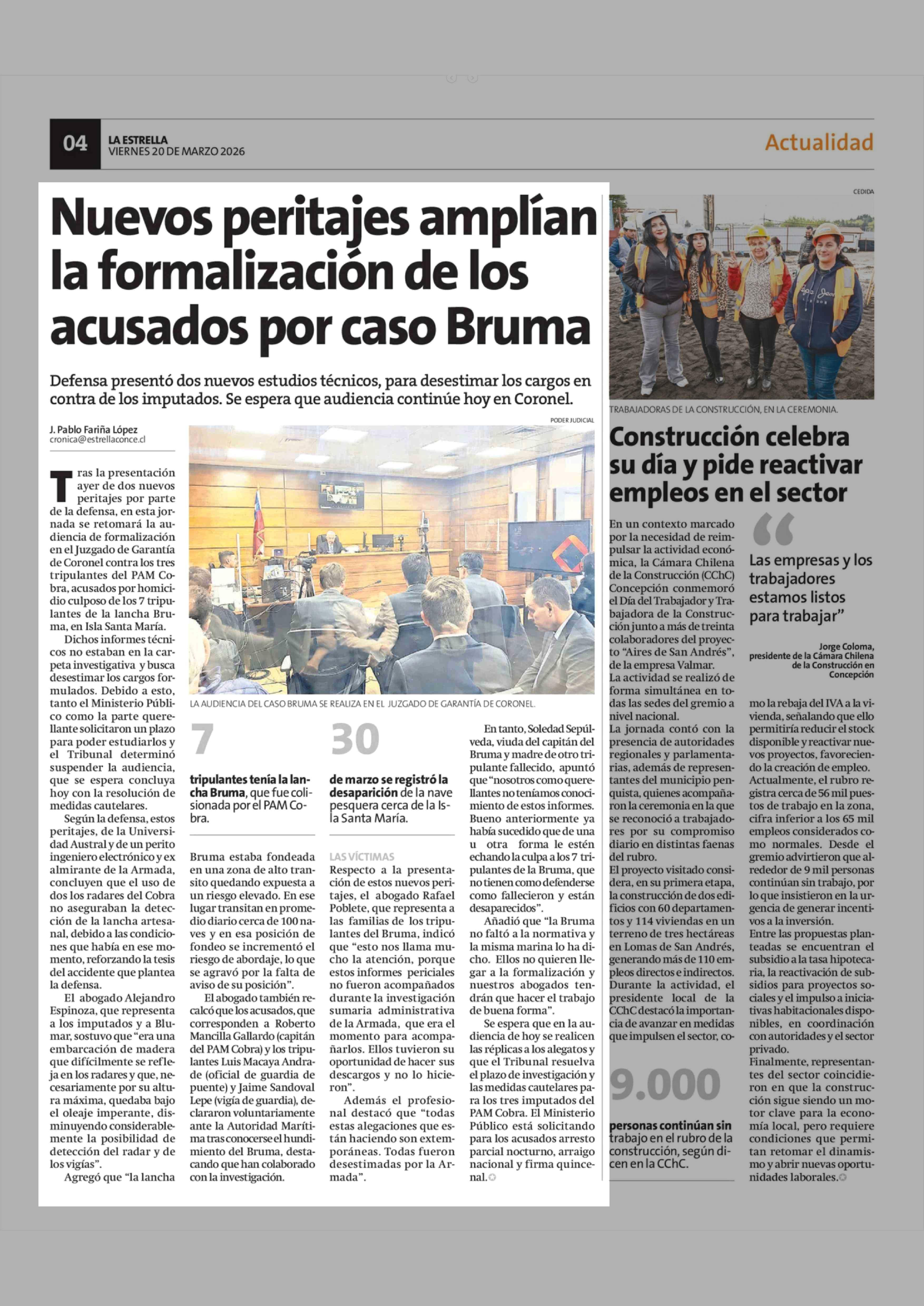 Nuevos peritajes amplían la formalización de los acusados por caso Bruma 20-03-2026 La Estrella de Concepción |