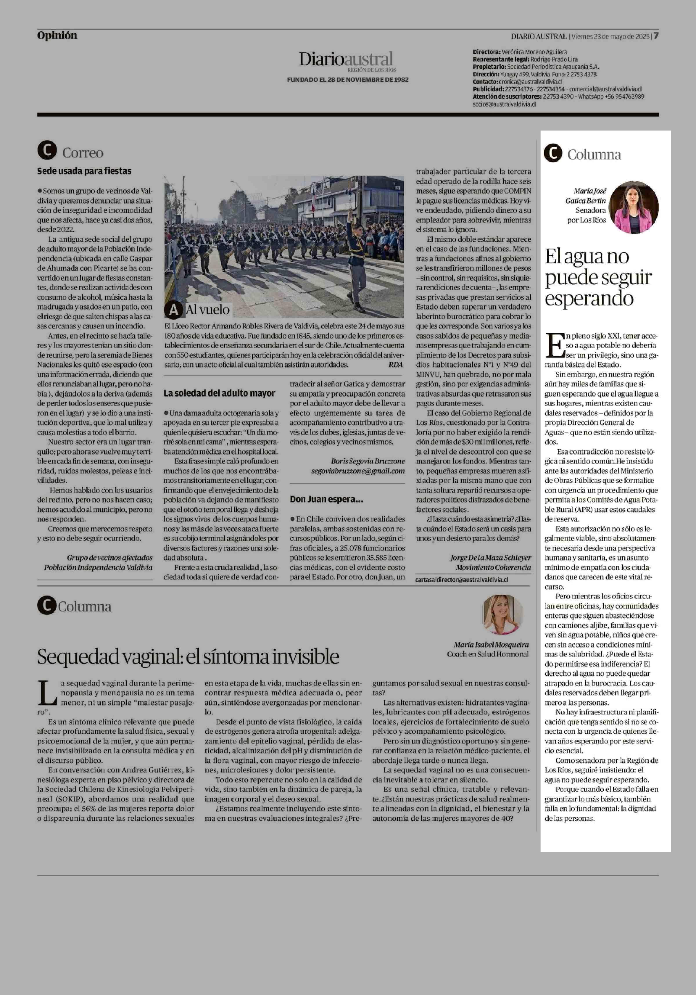 COLUMNAS DE OPINIÓN: El agua no puede seguir esperando 23-05-2025 Diario Austral Región de Los Ríos |