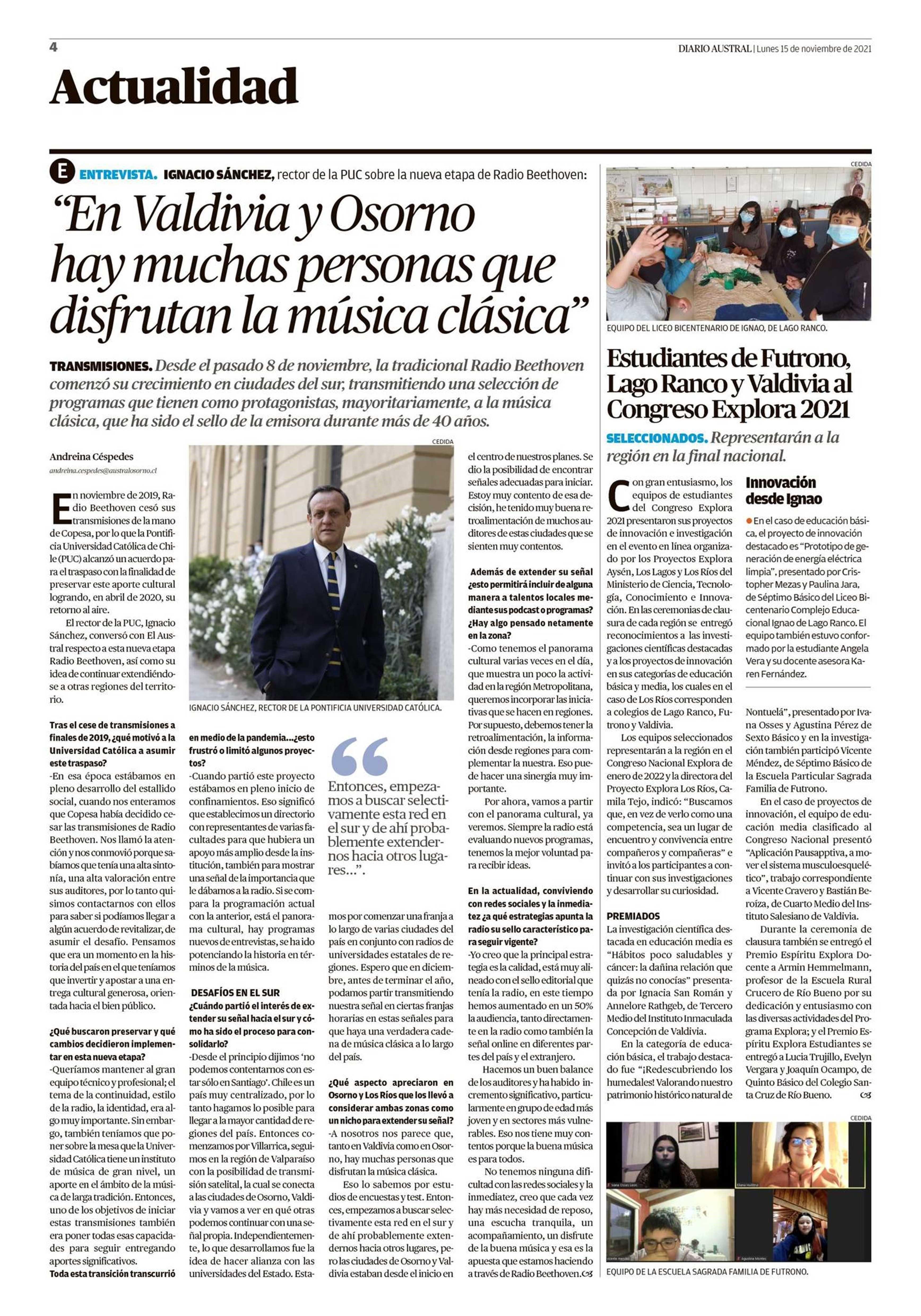 “En Valdivia y Osorno hay muchas personas que disfrutan la música clásica” 15-11-2021 Diario Austral Región de Los Ríos |