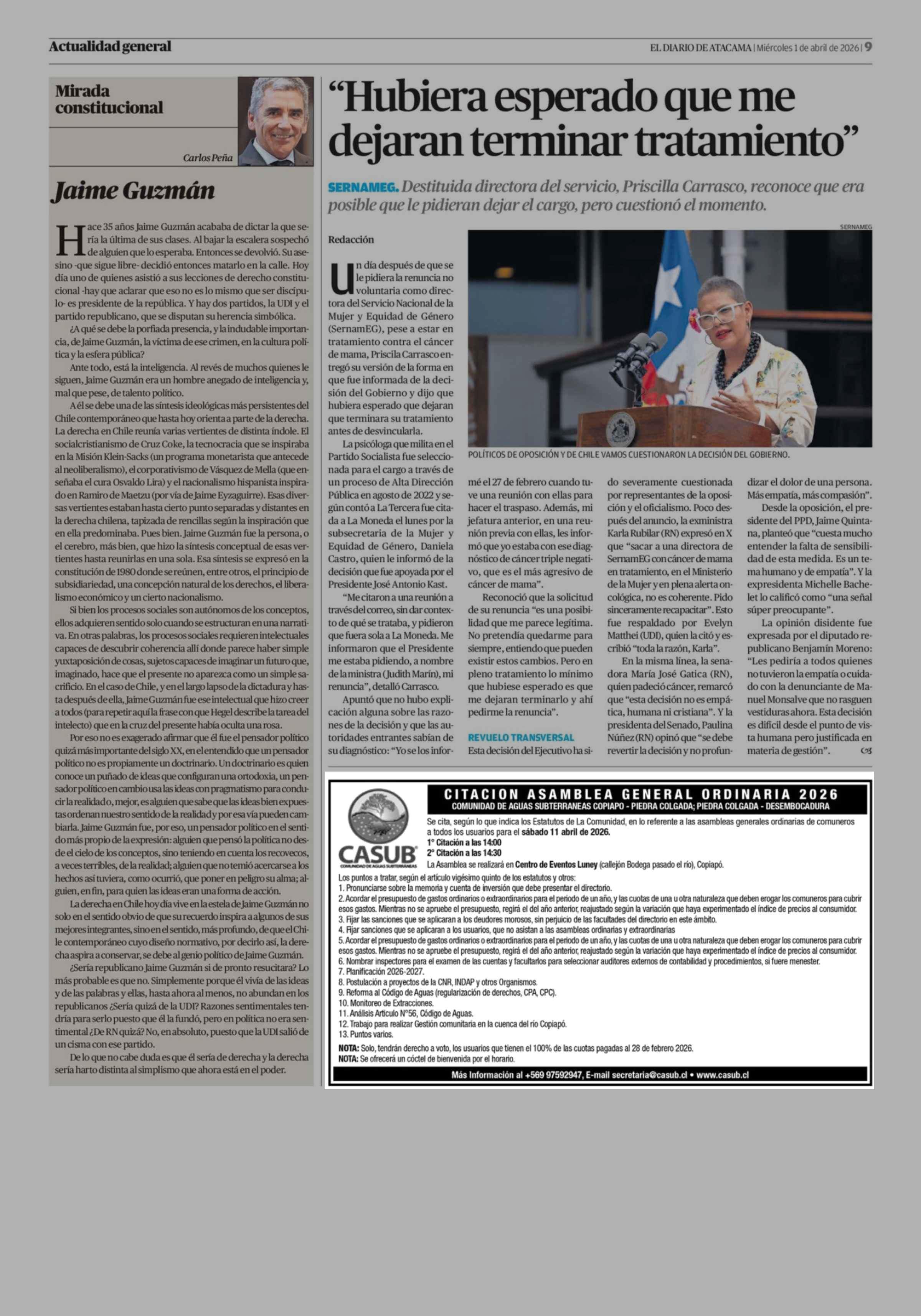 Título: Extractos: CITACION ASAMBLEA GENERAL ORDINARIA 2026 COMUNIDAD DE AGUAS SUBTERRANEAS COPIAPO - PIEDRA COLGADA; PIEDRA COLGADA - DESEMBOCADURA Se cita, según lo que indica los Estatutos de La Comunidad, en lo referente a las asambleas generales ordinarias de comuneros a todos los usuarios para el sába