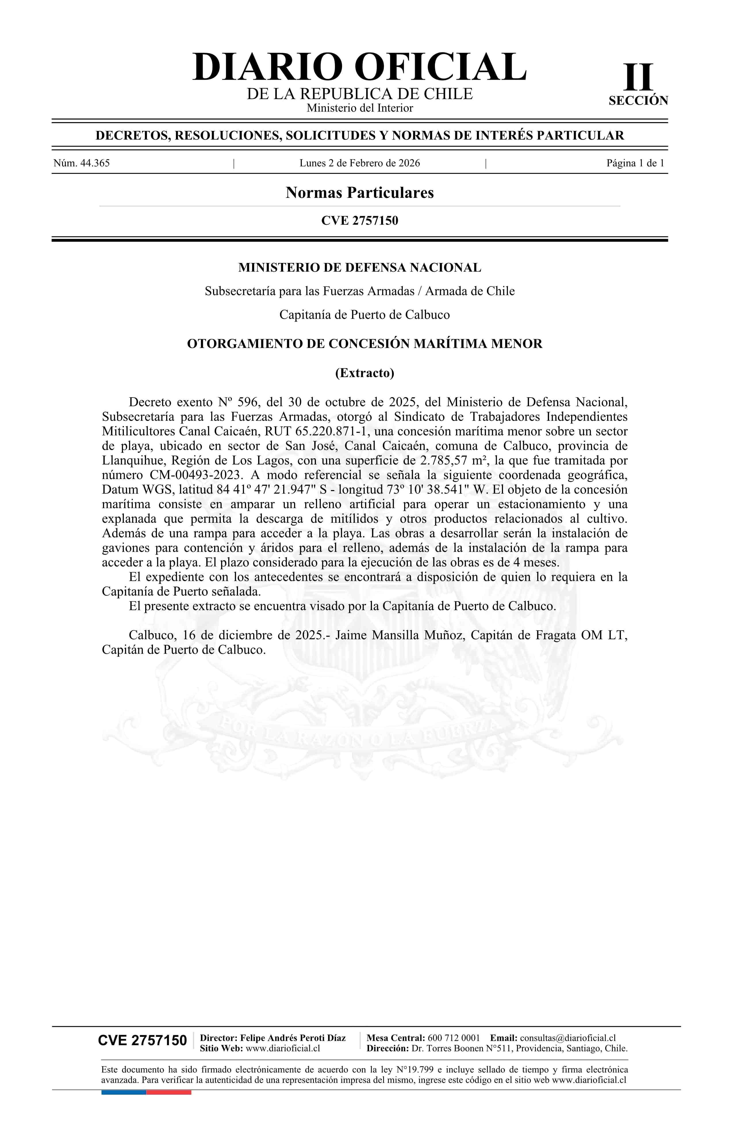 Título: Extracto de decreto exento número 596, de 2025.- Otorgamiento de concesión marítima menor