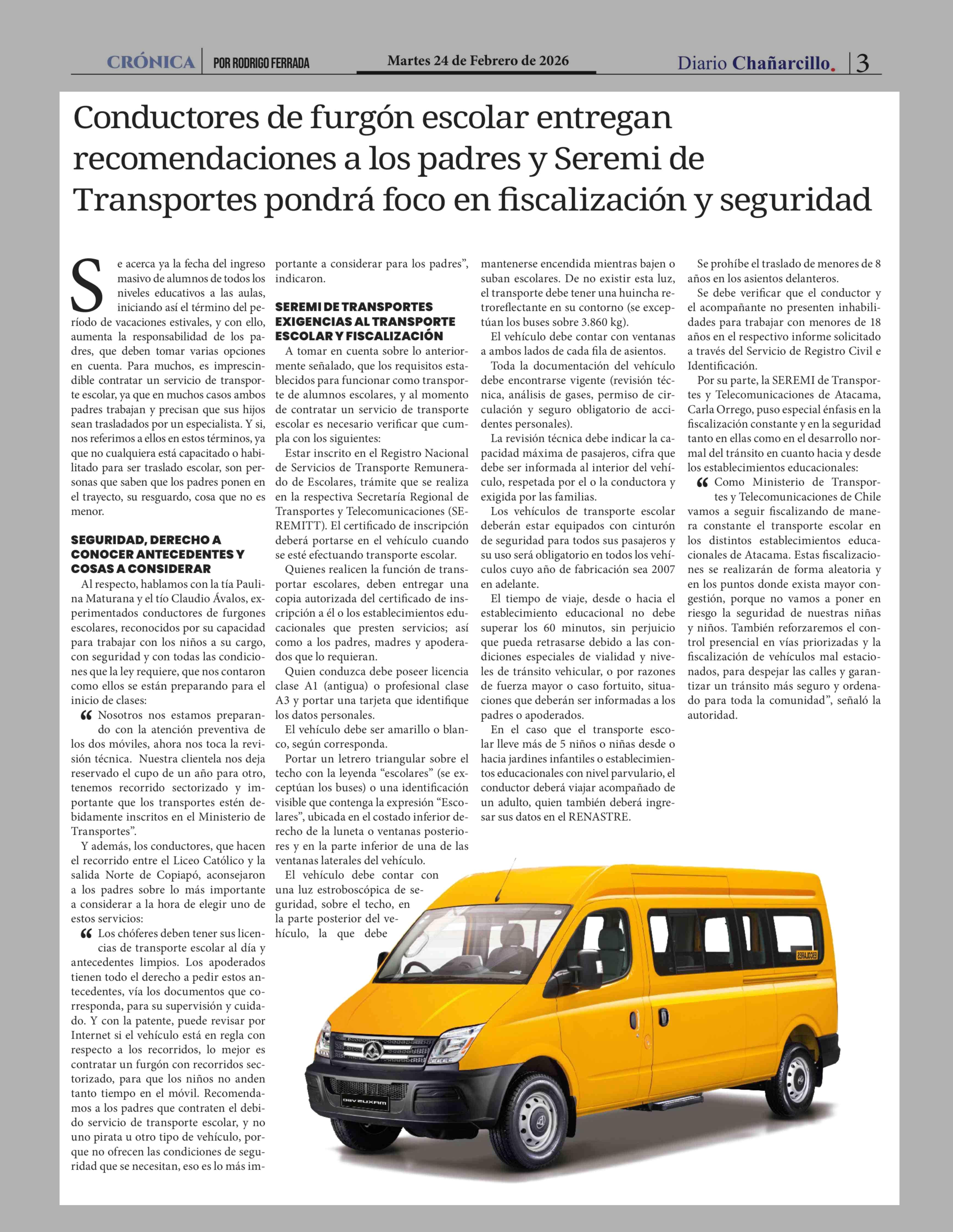 Conductores de furgón escolar entregan recomendaciones a los padres y Seremi de Transportes pondrá foco en fiscalización y seguridad 24-02-2026 Diario Chañarcillo |