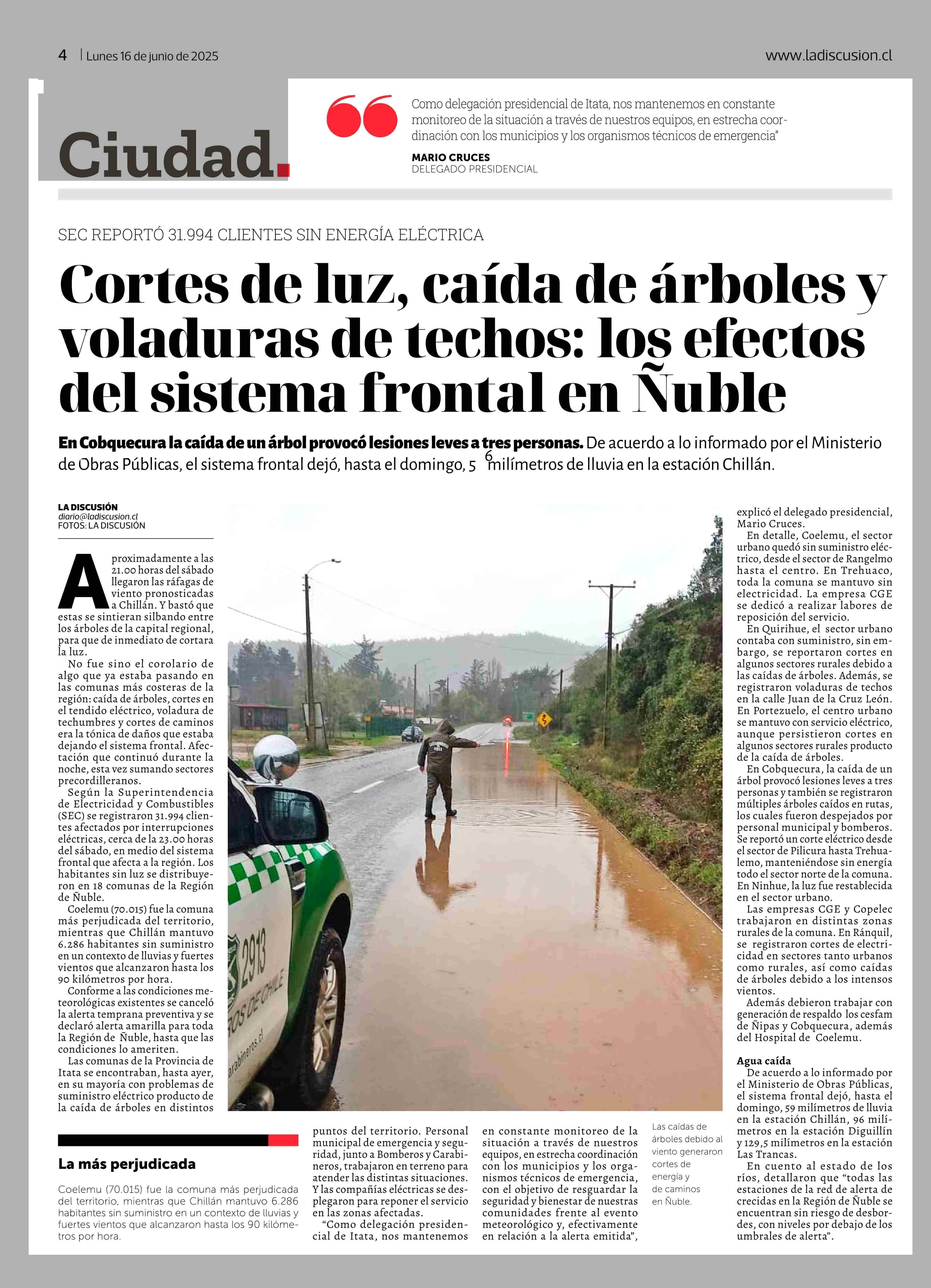 Cortes de luz, caída de árboles y voladuras de techos: los efectos del sistema frontal en Ñuble 16-06-2025 La Discusión |