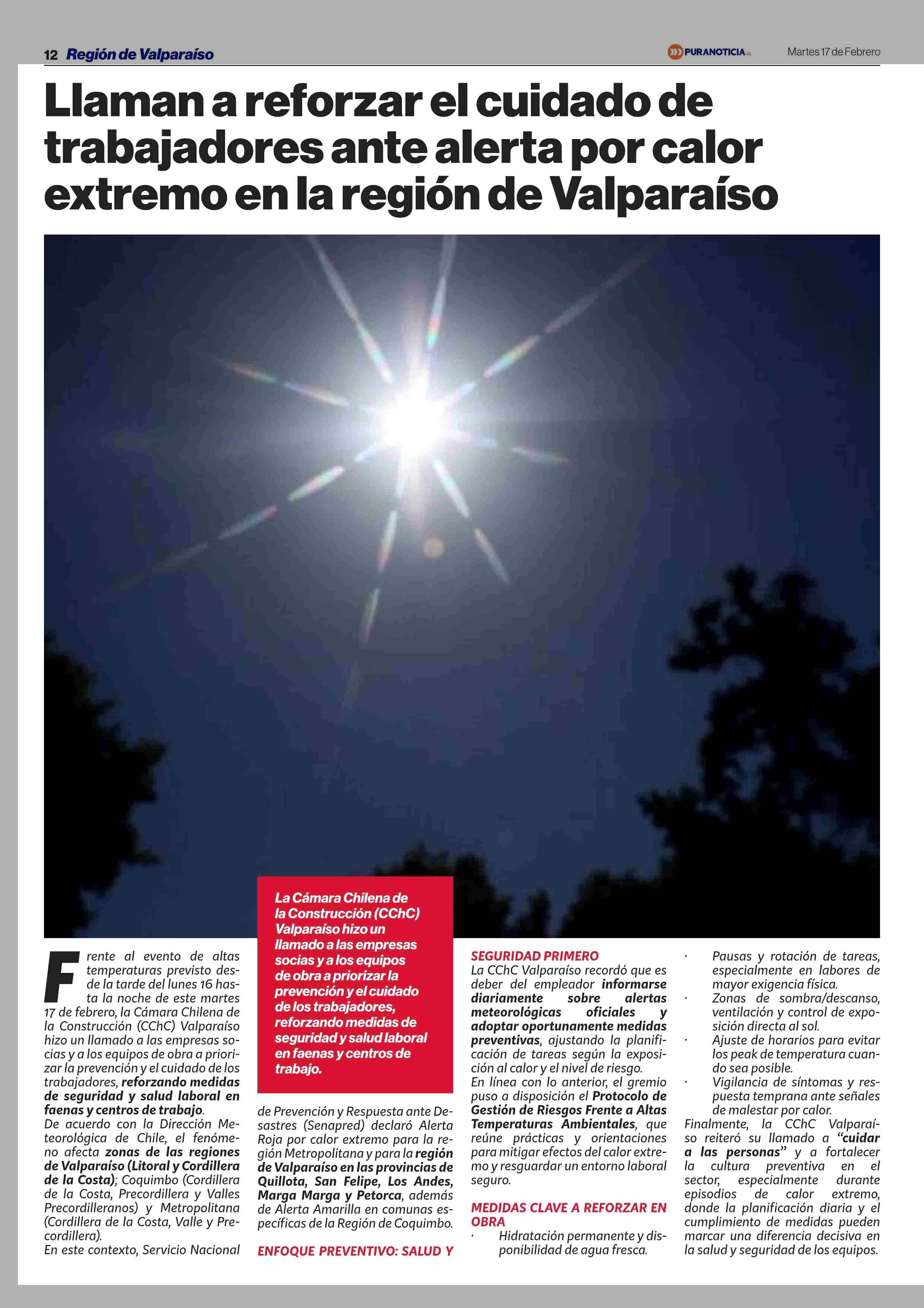 Llaman a reforzar el cuidado de trabajadores ante alerta por calor extremo en la región de Valparaíso 17-02-2026 Puranoticia.cl |