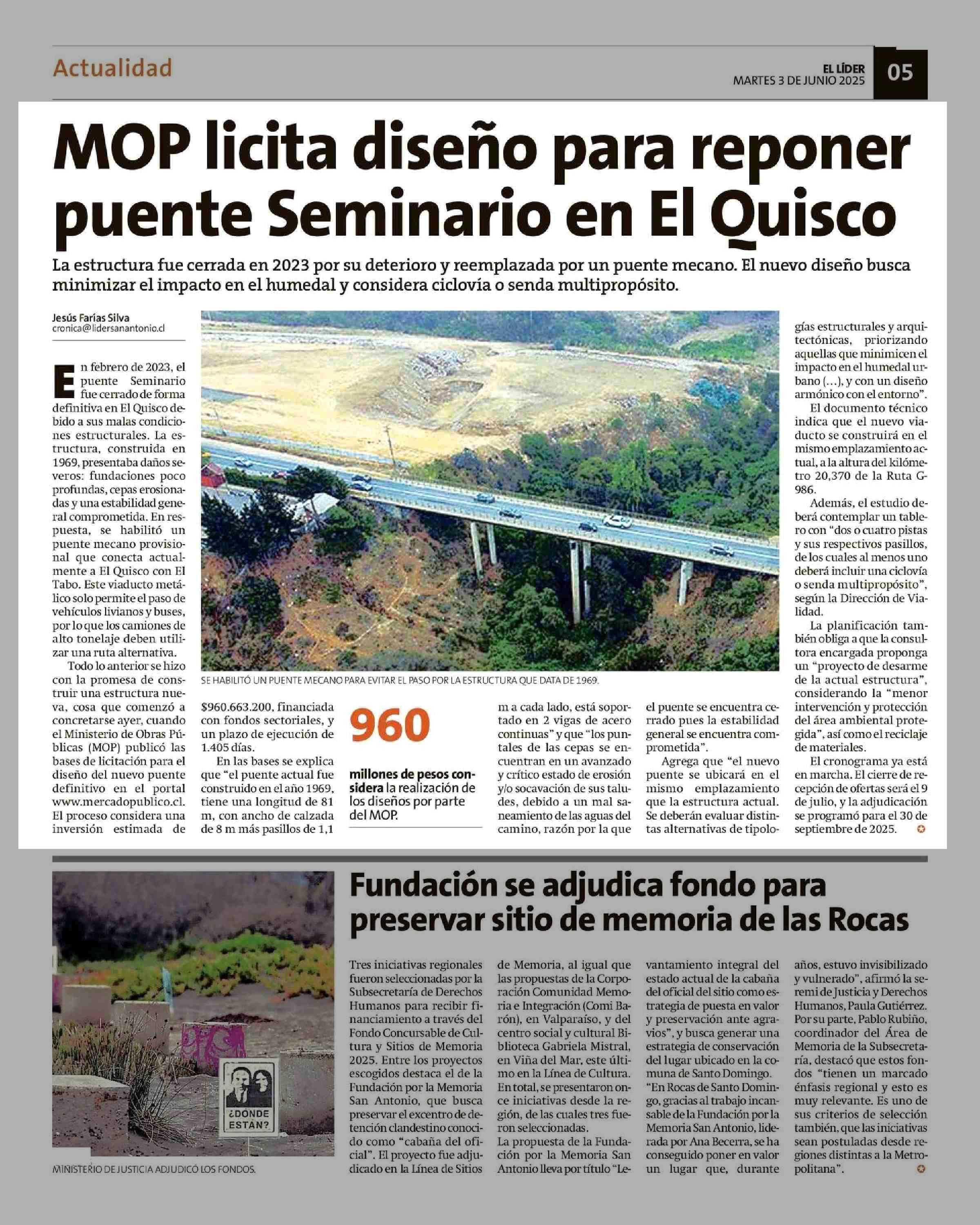MOP licita diseño para reponer puente Seminario en El Quisco 03-06-2025 El Líder |