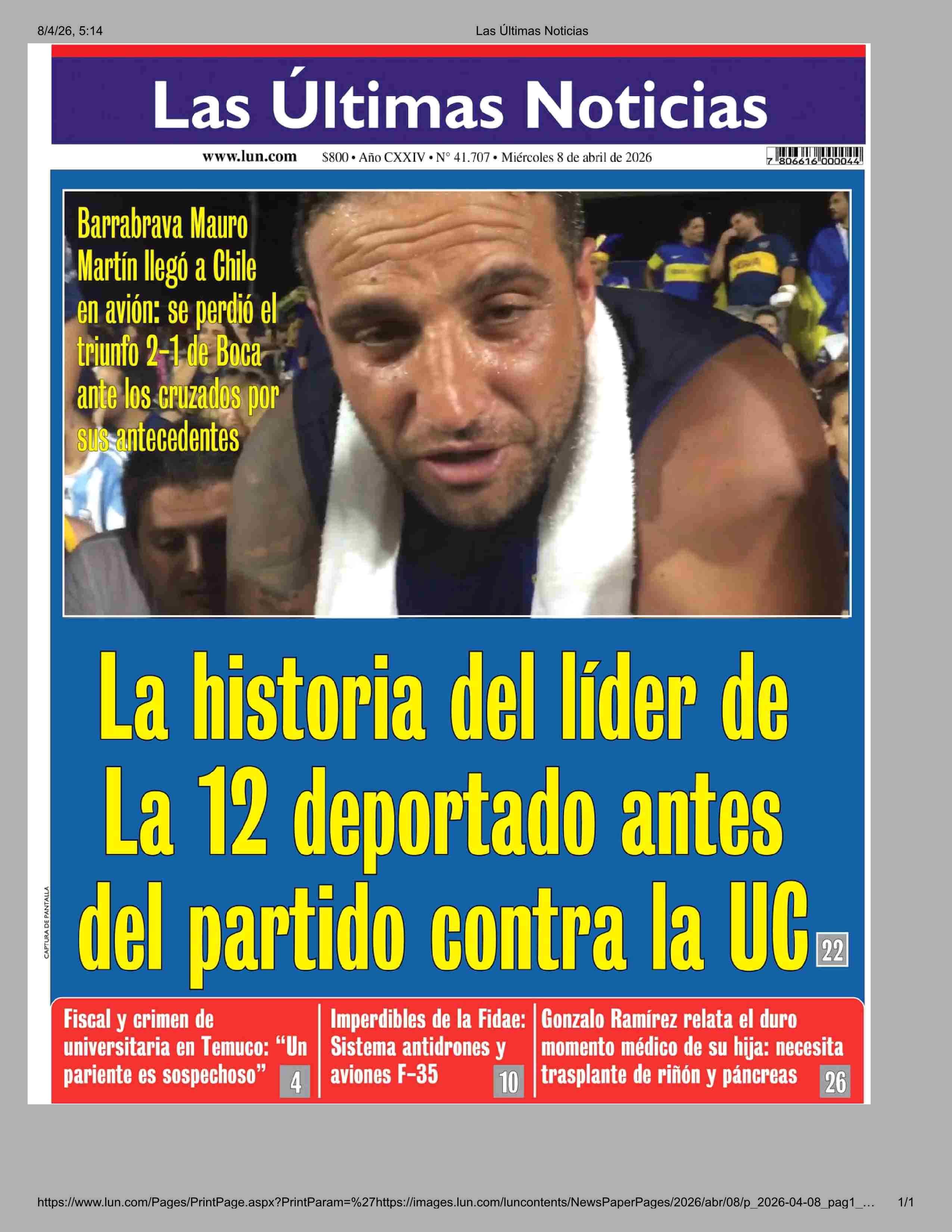 PORTADA LAS ÚLTIMAS NOTICIAS SEGUNDA EDICIÓN - CHILE 08-04-2026 Las Últimas Noticias |